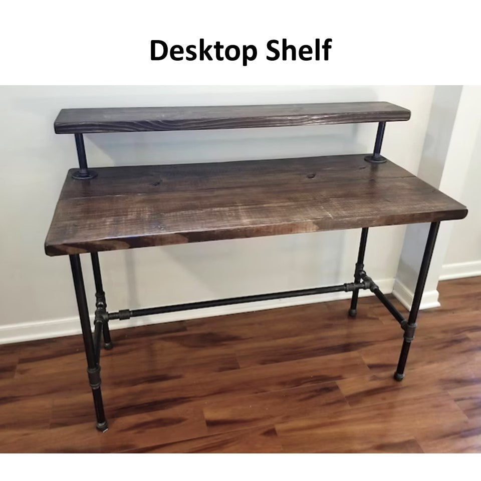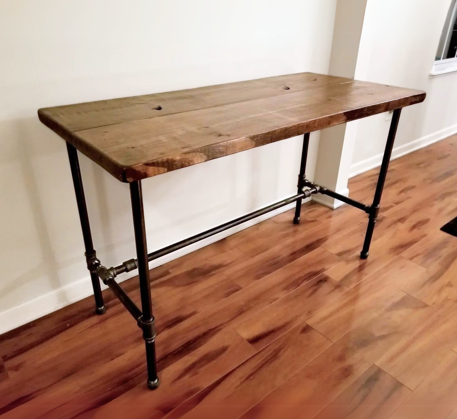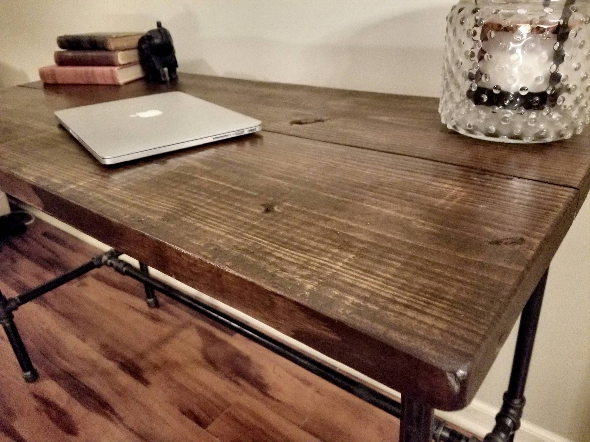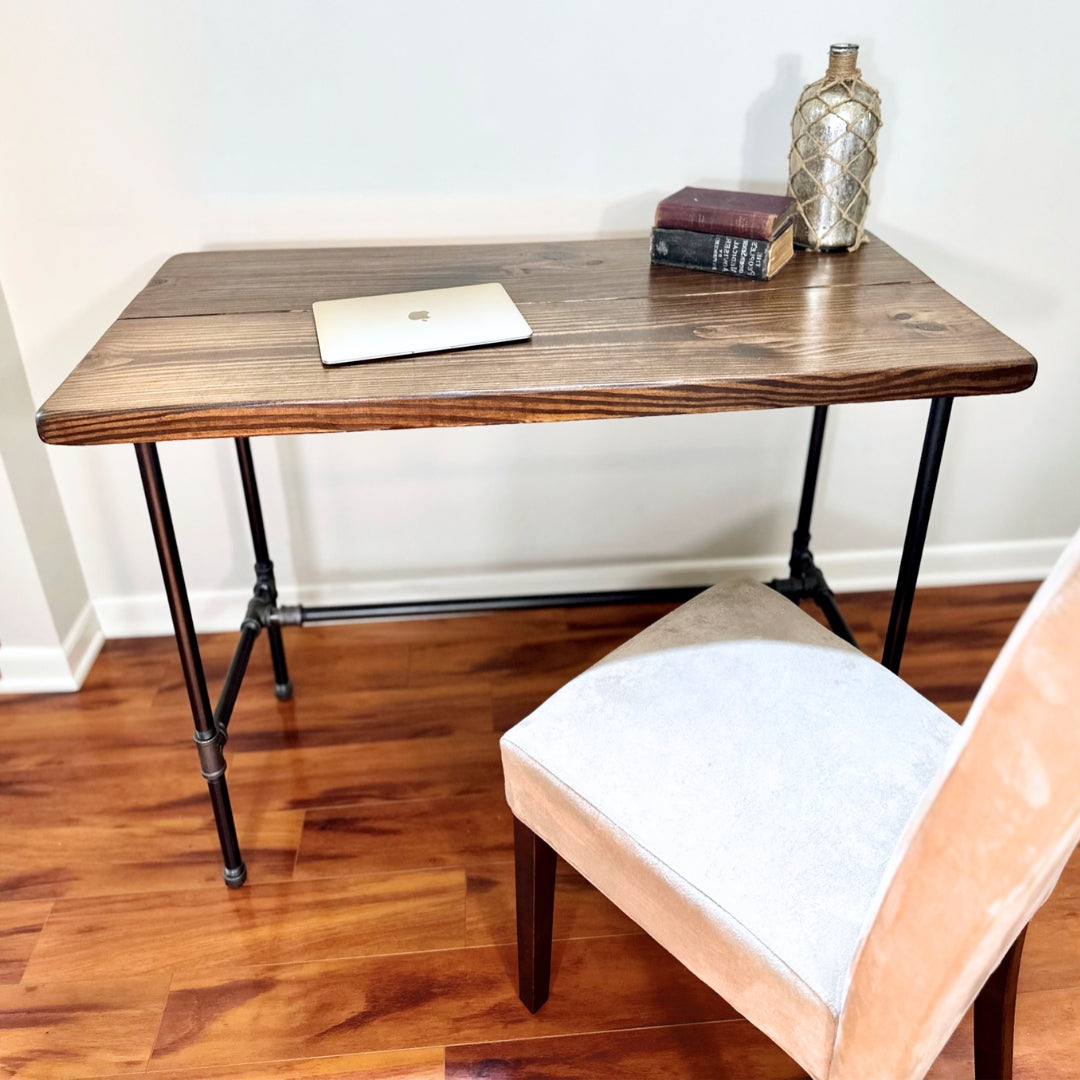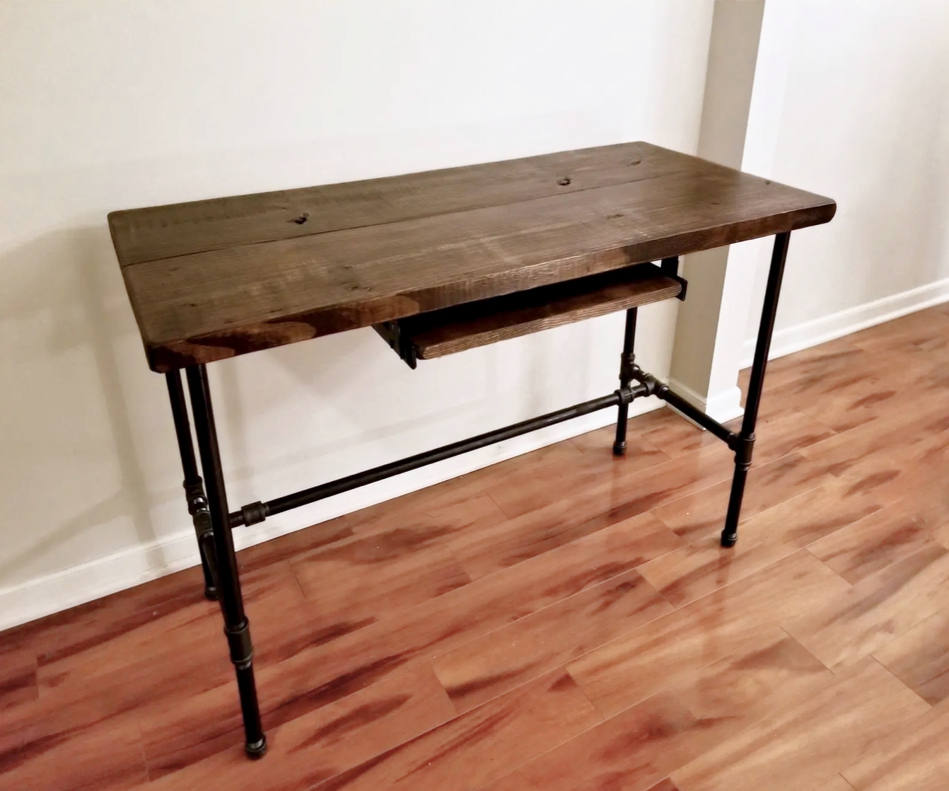 This desk is built by hand in America from steel legs and an American made solid wood pine plank desktop. The solid wood desktop is warm and comfortable and full of character. Every plank of wood varies and will feature unique natural grain patterns, colors, knots, dents, depressions, and surface texture. Please see the images for the most accurate representation of the woods character.
