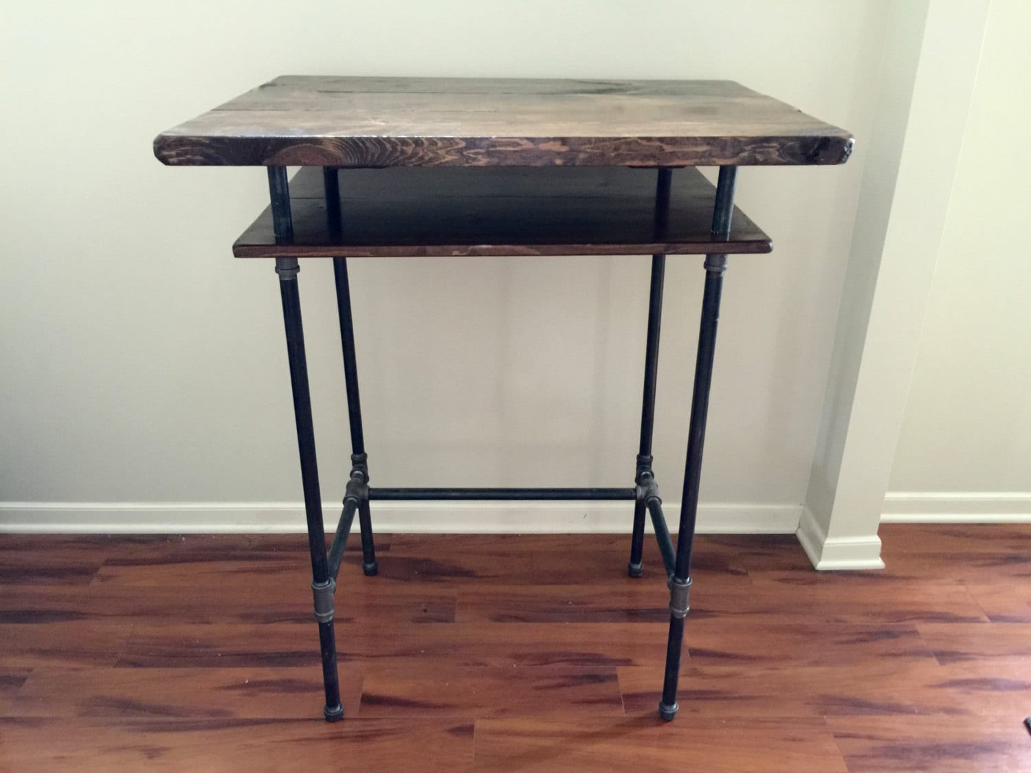 Desk is made of hand picked Premium Pine wood and black steel legs/base. Shelf is 6" below underside of desktop. HEIGHT -- Please type your height selection (anything below 45")* in the "Notes to Seller" section during checkout. Table top is 36" x 27.5" and 44" high. Wood stain shown is Dark Walnut. Additional stain options can be viewed on our website: https://www.steelandpine.com/stains/ Feel free to contact us if you are looking for a custom size or stain. *For heights over 45" contact us for custom pricing
