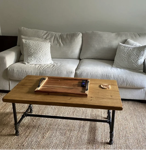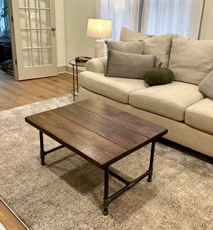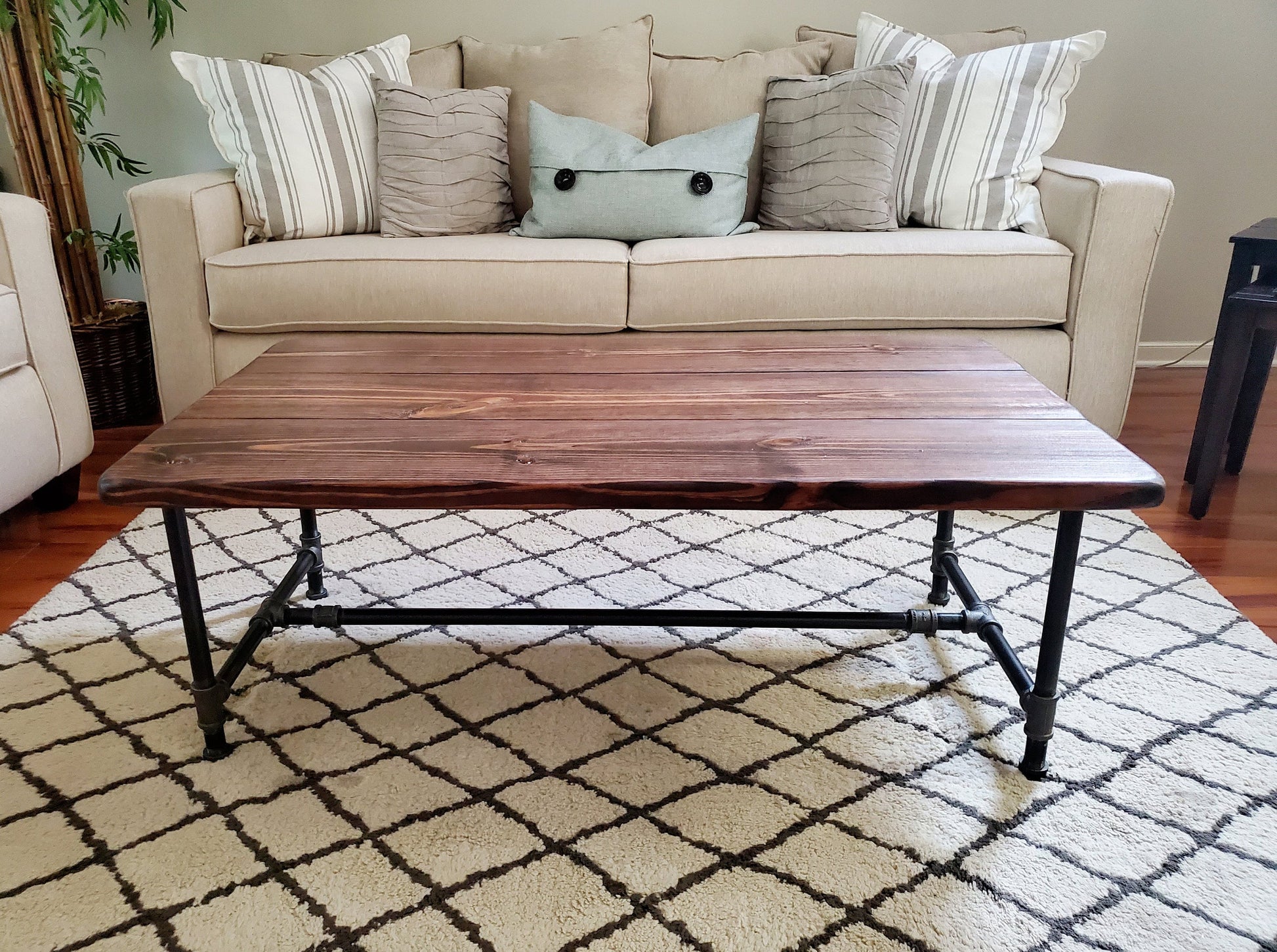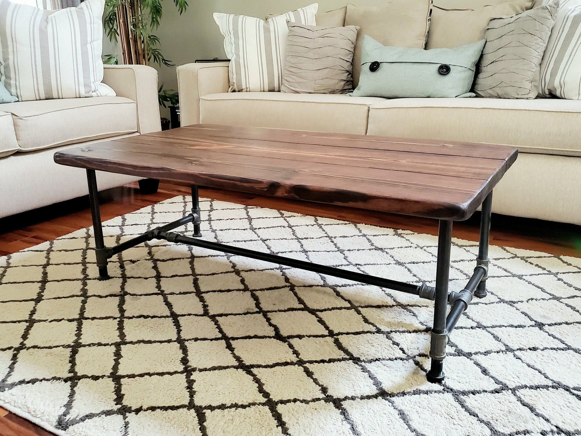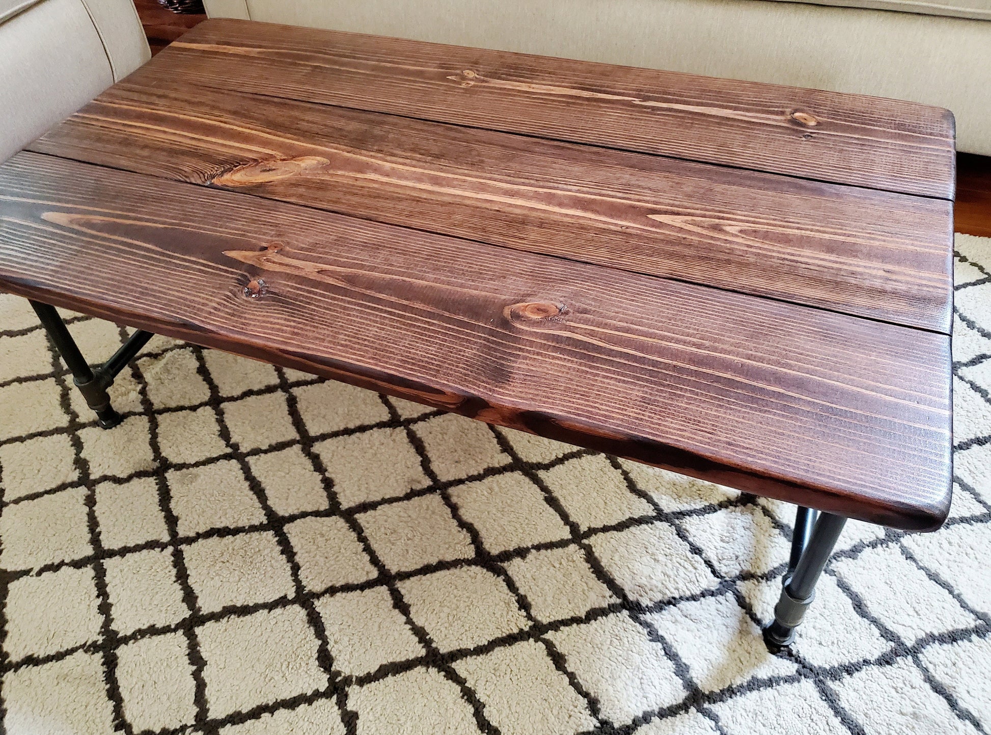 This rustic coffee table is made of hand picked Premium Pine wood and black steel piping. The table shown is 48" x 27.5" and is 18" high with a Red Mahogany stain. Feel free to contact us if you would like a custom size or stain.
