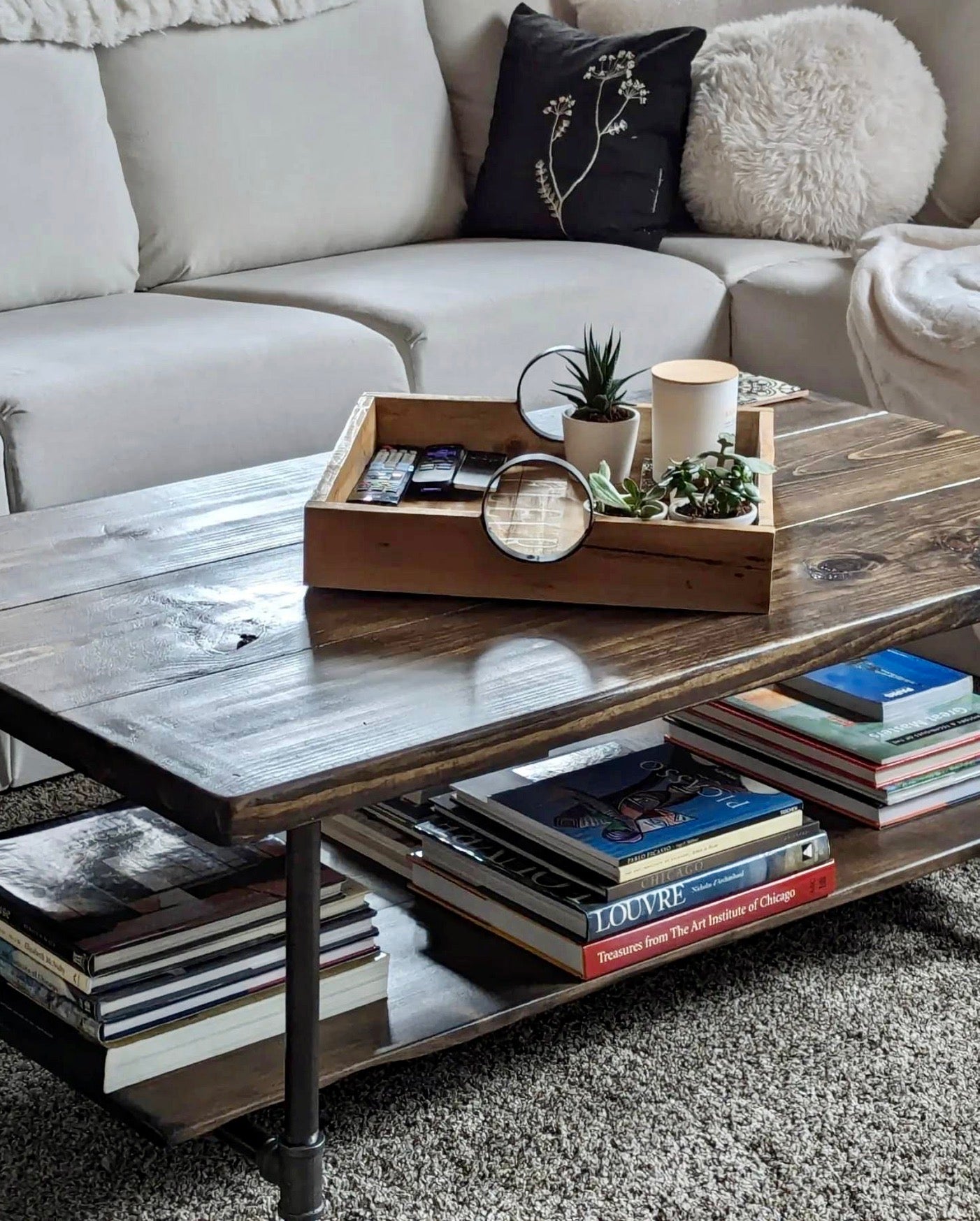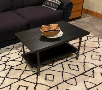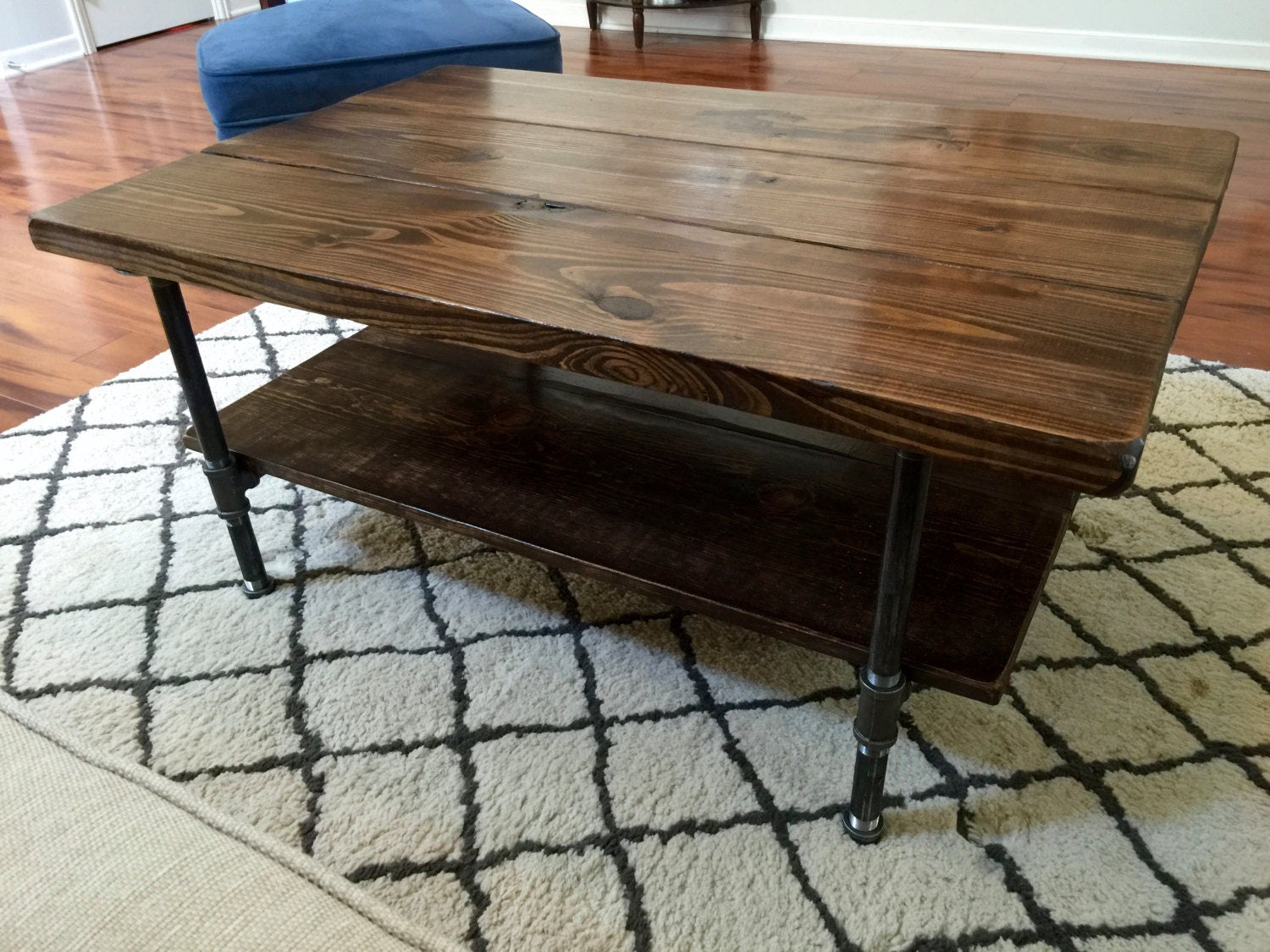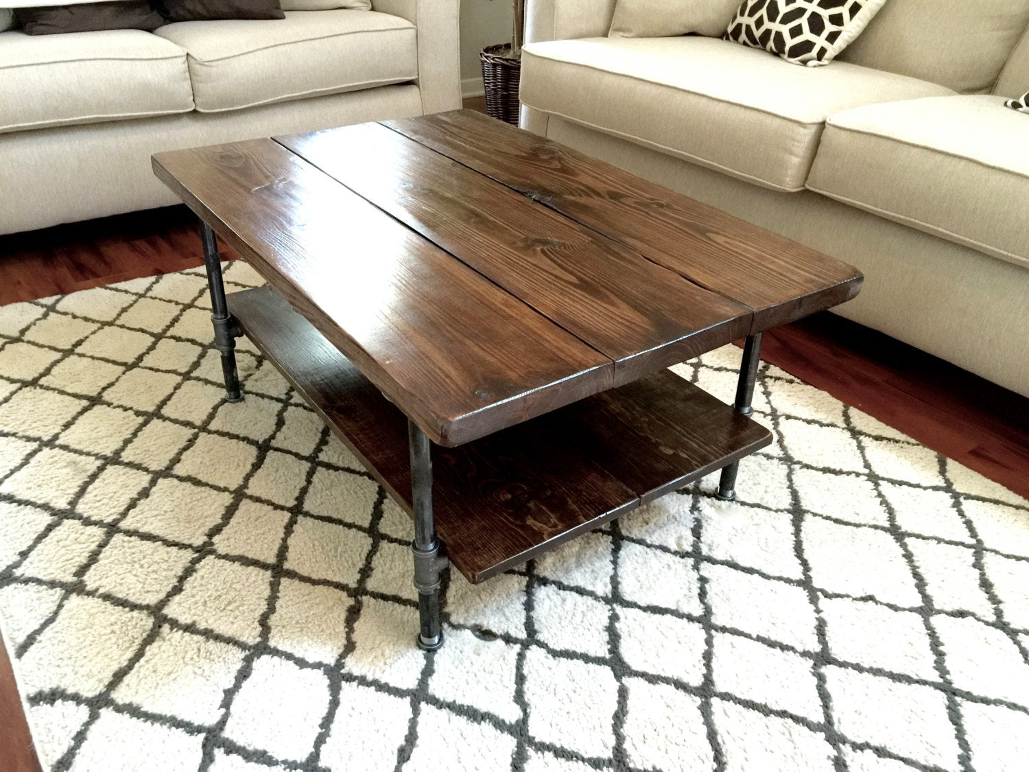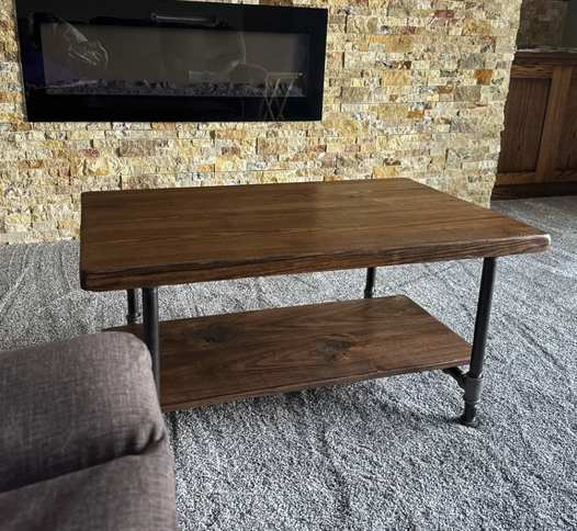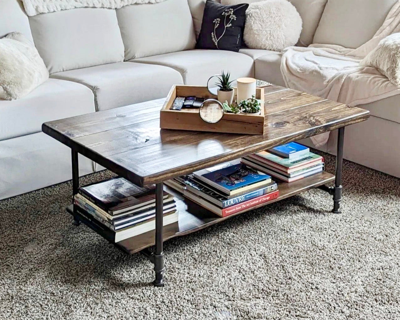 This rustic coffee table is made of hand picked Premium Pine wood and 3/4" black steel pipe. The table features a lower shelf for storage, baskets, books, or any decor items that suit your style. The table shown is 36" x 27.5" and is 18" high with a Dark Walnut stain.