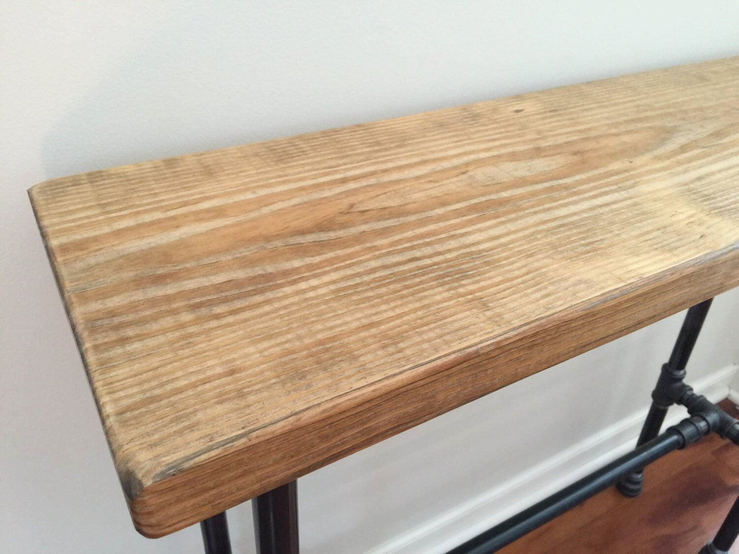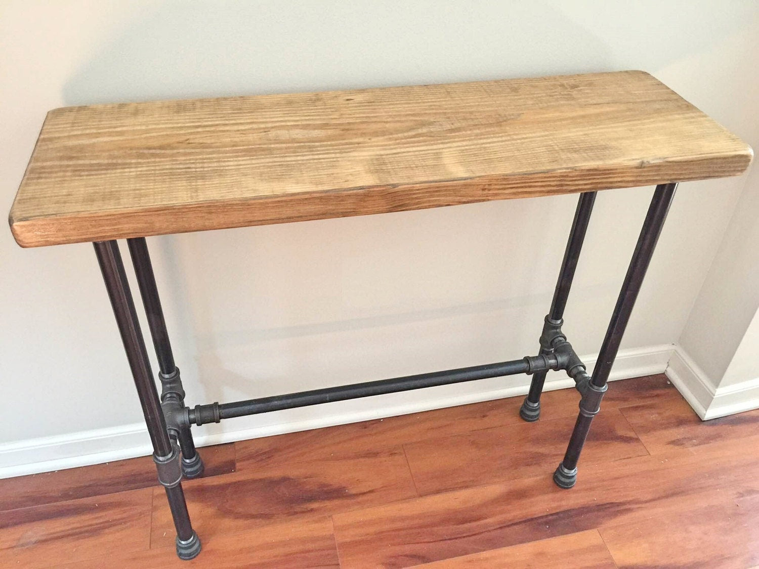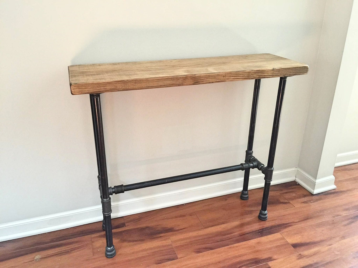 This rustic console table is made of handpicked Premium Pine wood and black steel pipe. The table shown is 36"x11.25" and is 30" high with a Weathered Oak stain. Feel free to contact us if you would like a custom size or stain.