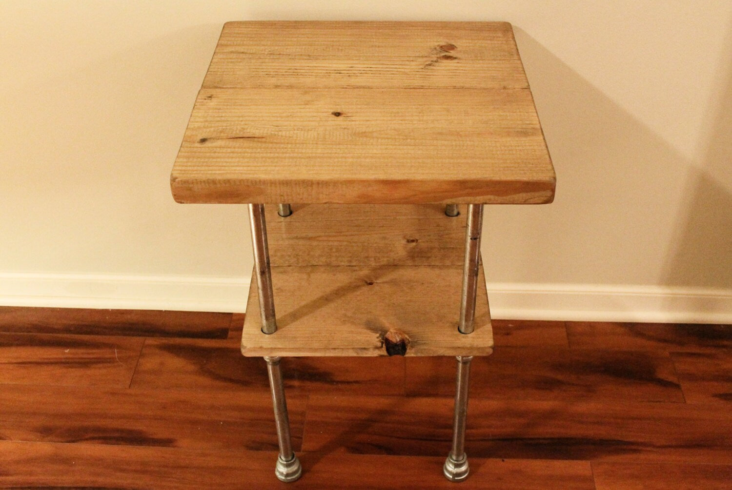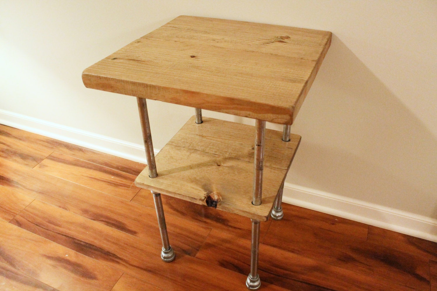 This rustic side table is made of hand picked Premium Pine wood and galvanized steel pipe. The table shown is 18" by 18" and is 24" high with a Weathered Oak stain. Feel free to contact us if you would like a custom size or stain.