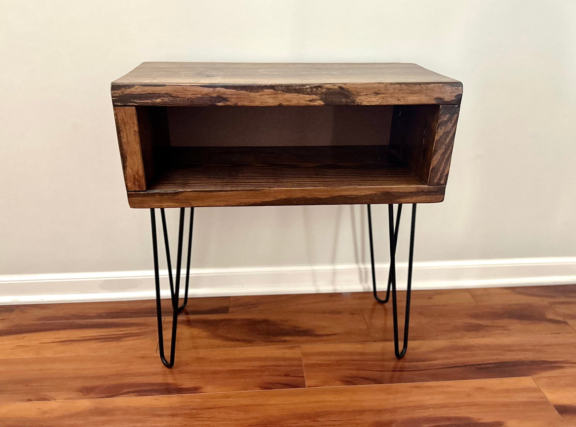 This rustic media end table is made of hand picked Premium Pine wood. The table features a box design with lower shelf for record storage, baskets, books, or any decor items that suit your style.