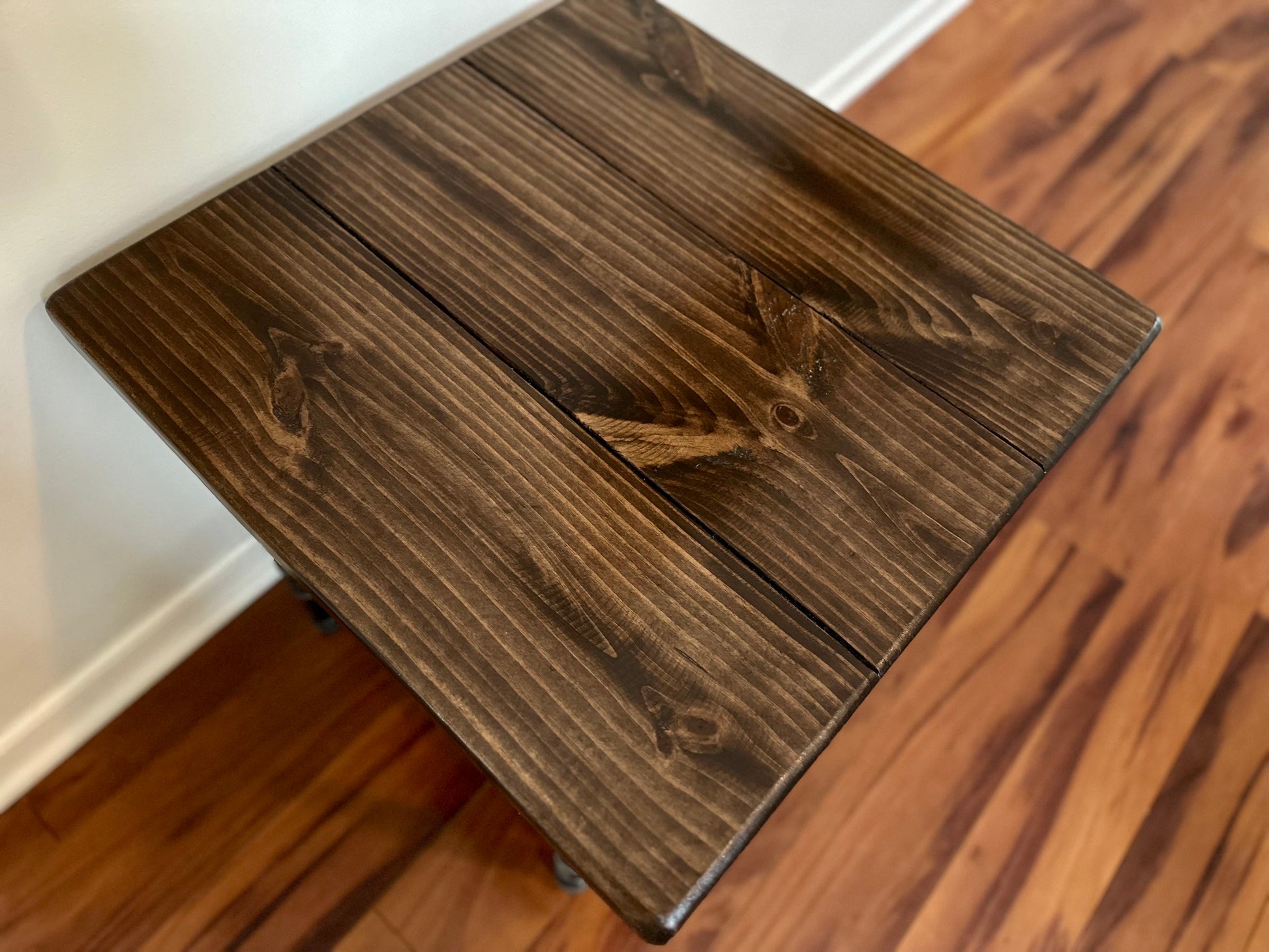 The table shown is 21.75" x 21.75" and is 20" high with a Dark Walnut stain. Feel free to contact us if you would like a custom size or stain.