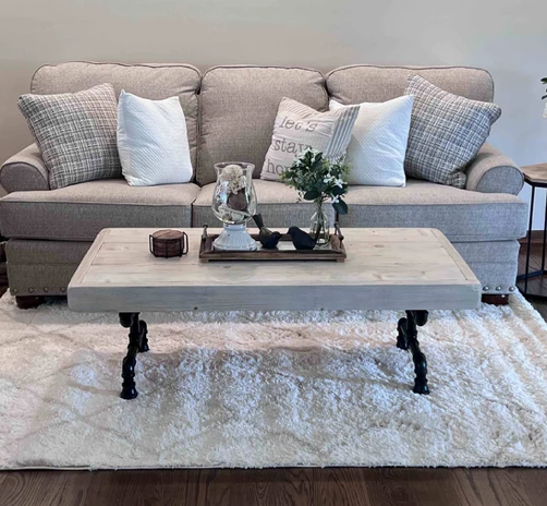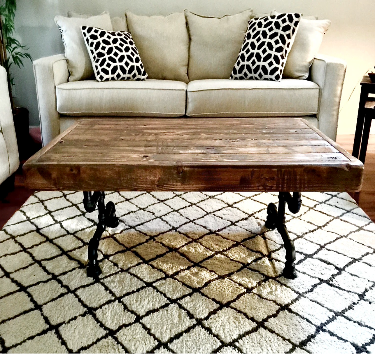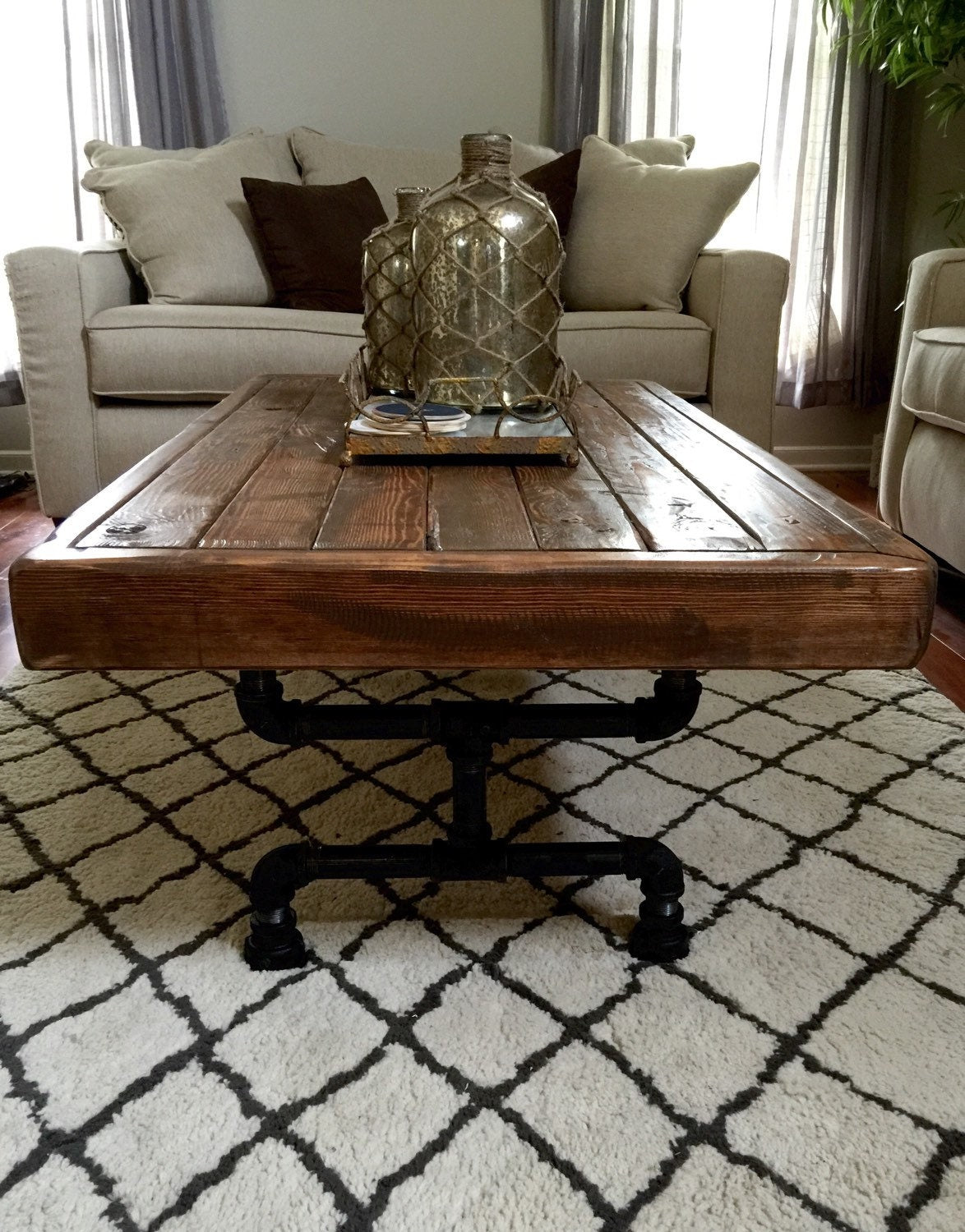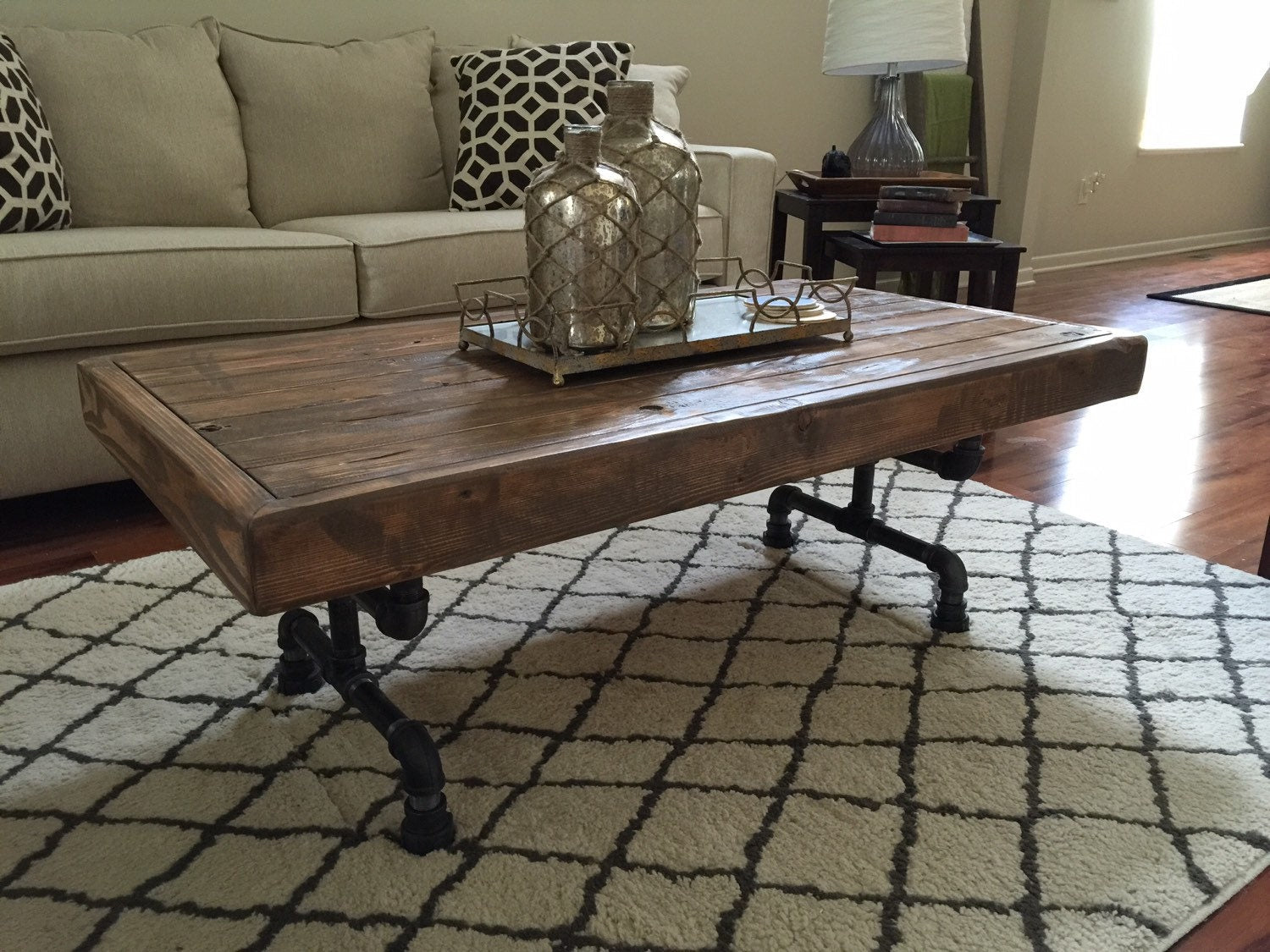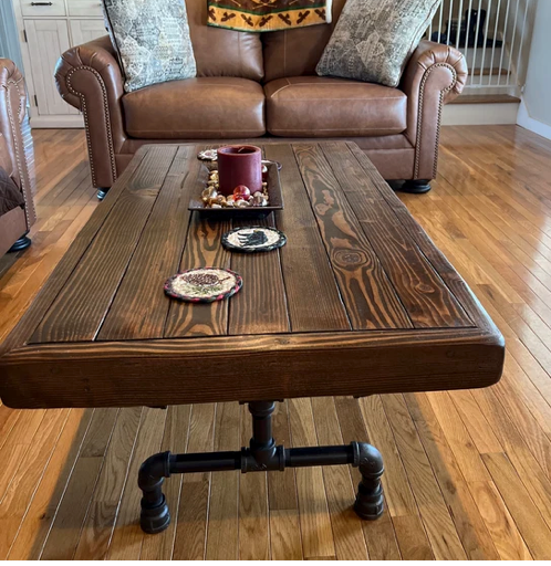 This weathered coffee table is made of hand picked pine wood and large 1" black steel pipe. The table shown is 51"L x 27.5"W and is 18.5" high with our Weathered Brown finish. Feel free to contact us if you would like a custom size or stain.