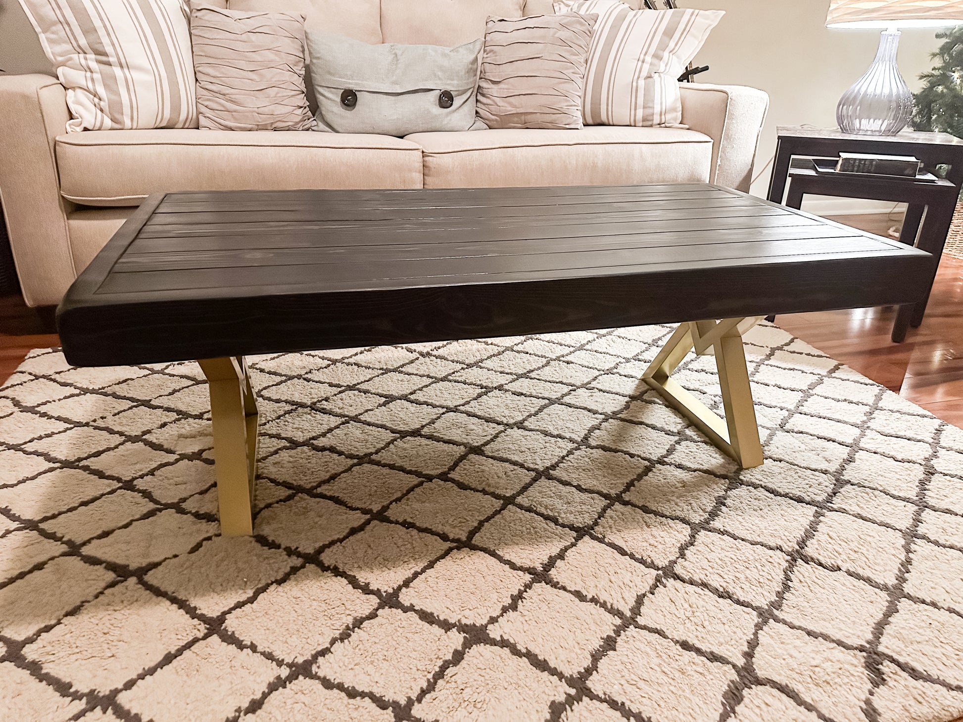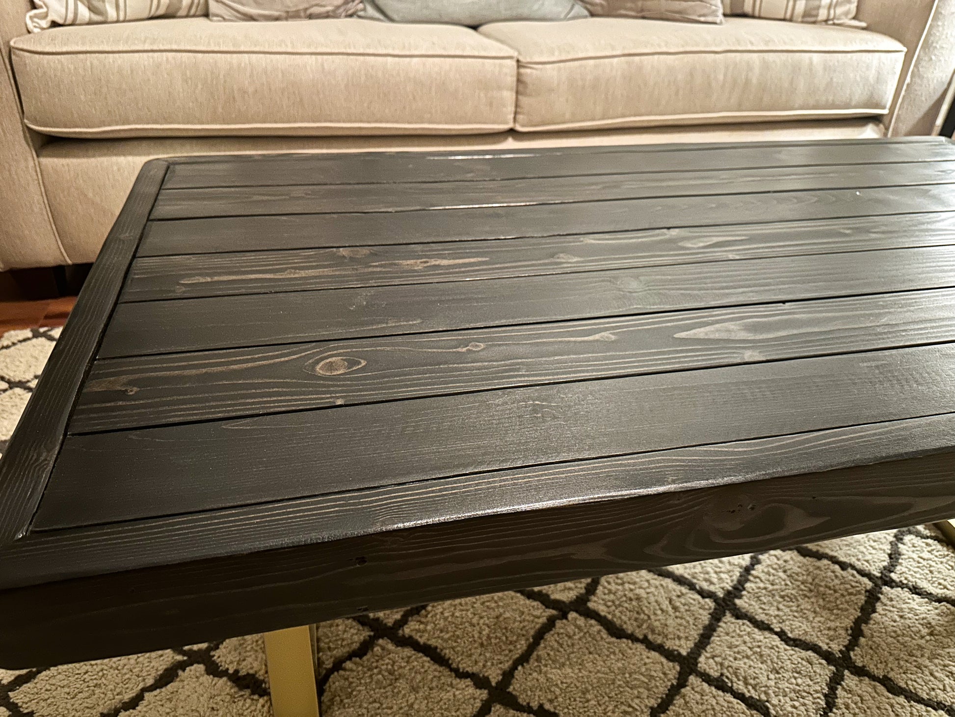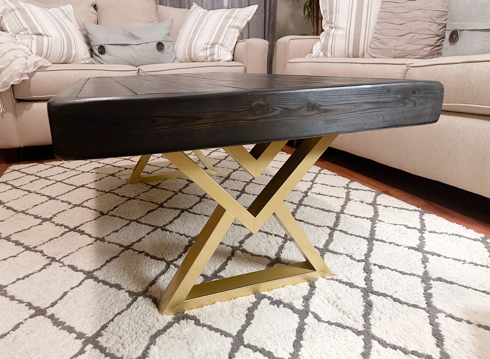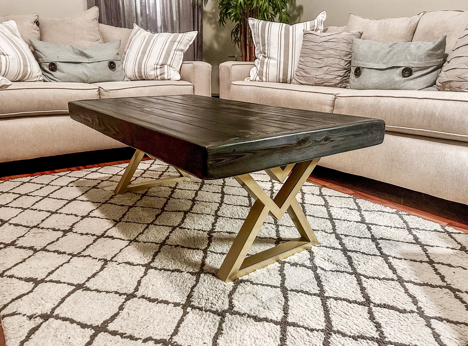 This weathered coffee table is made of hand picked pine wood and extra large gold steel pipe.