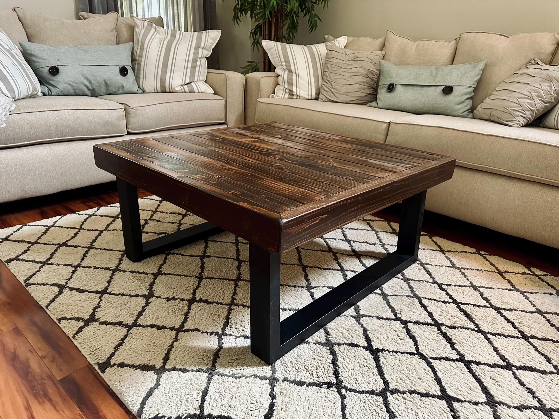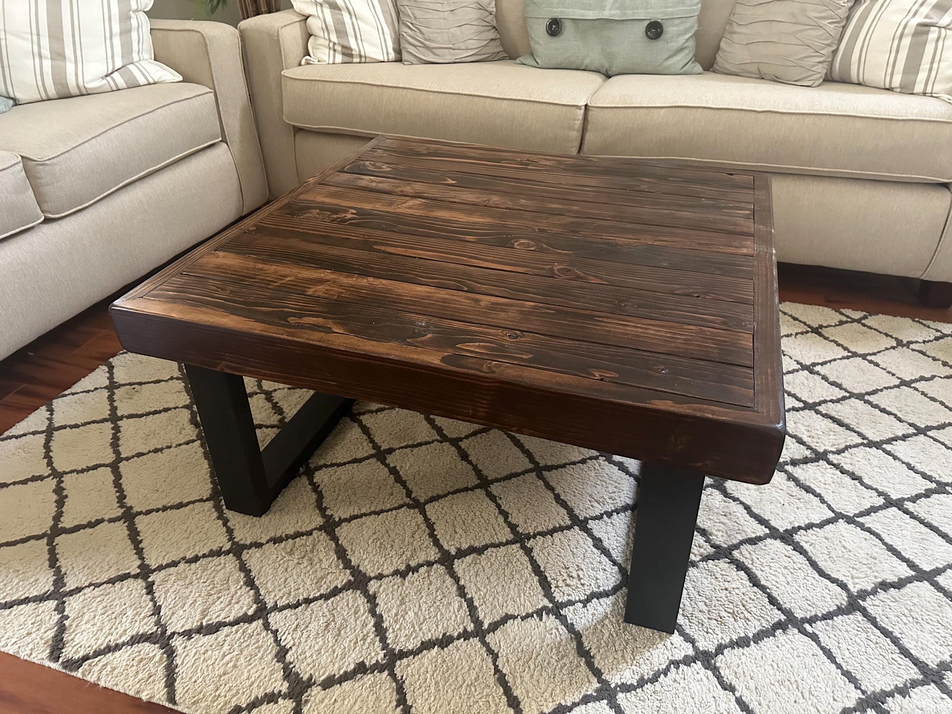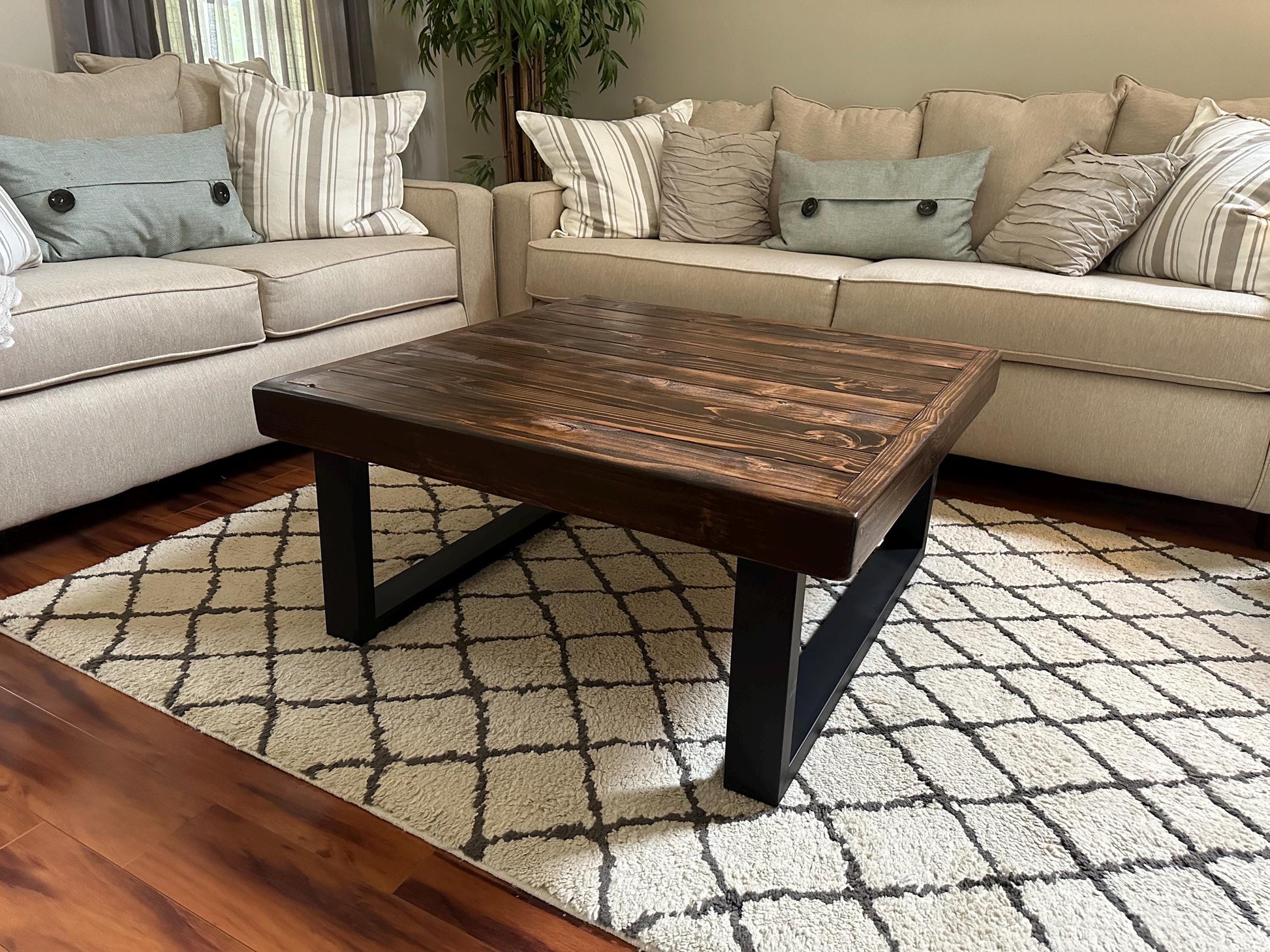 This beautiful weathered coffee table is made of hand picked pine wood and large square steel pipe that is finished.