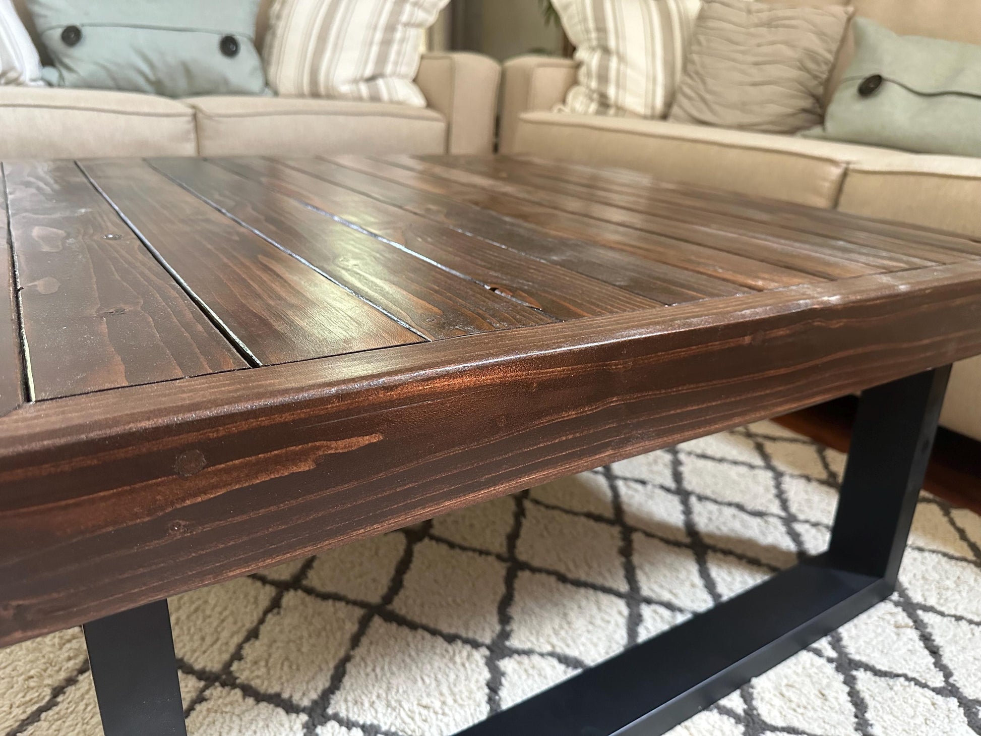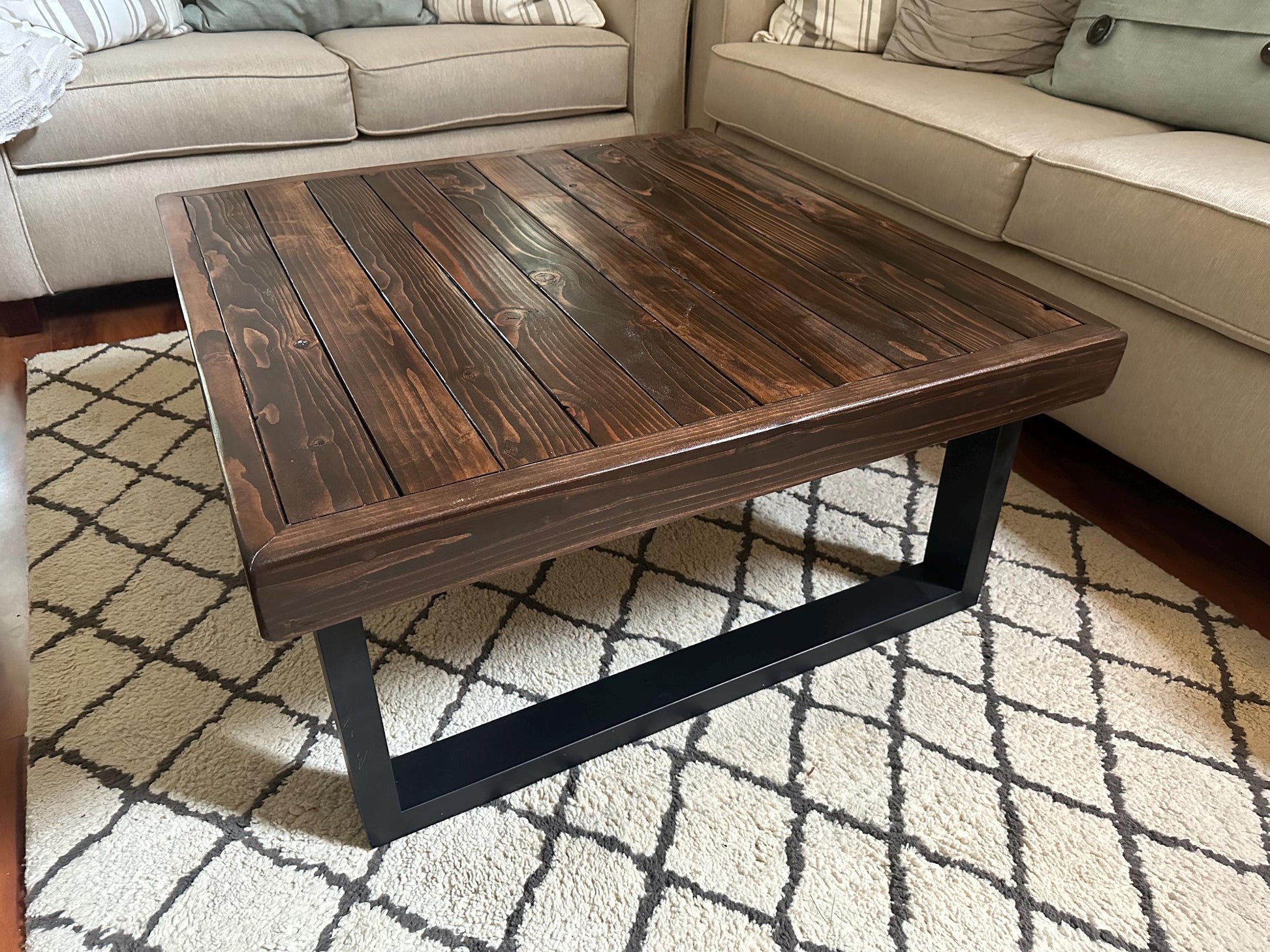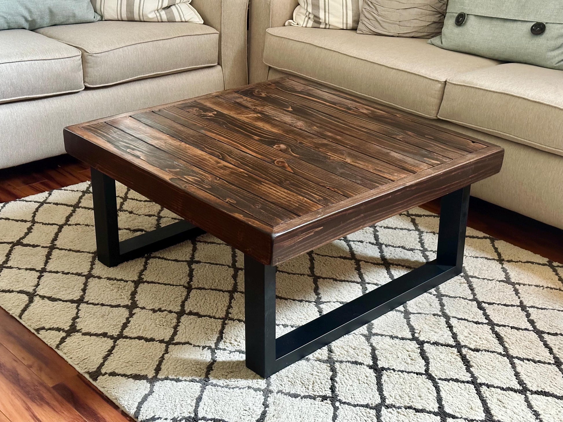 This beautiful weathered coffee table is made of hand picked pine wood and large square steel pipe that is finished.