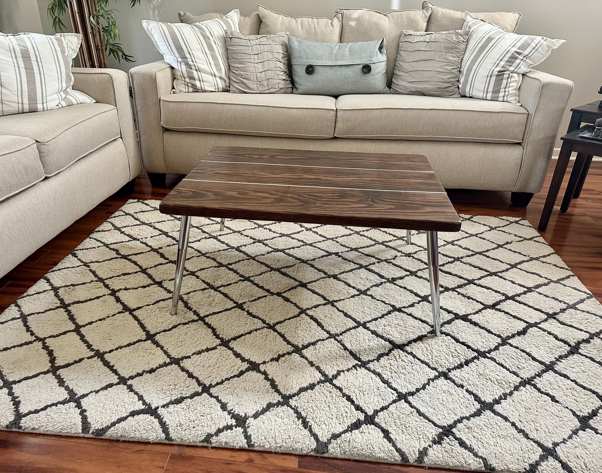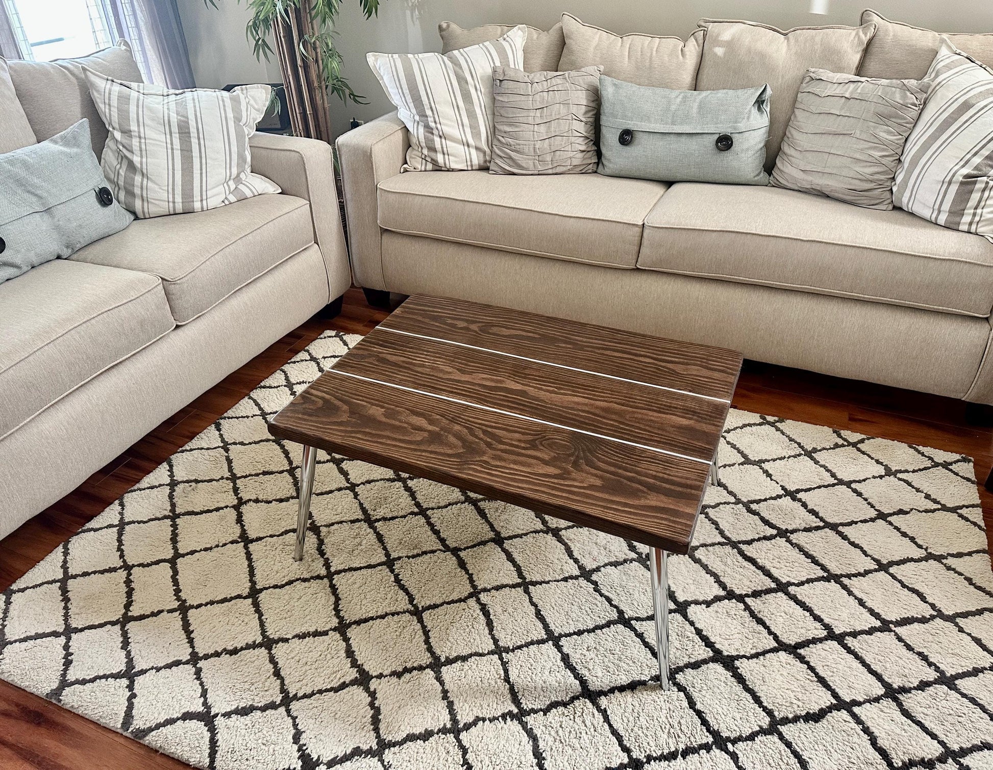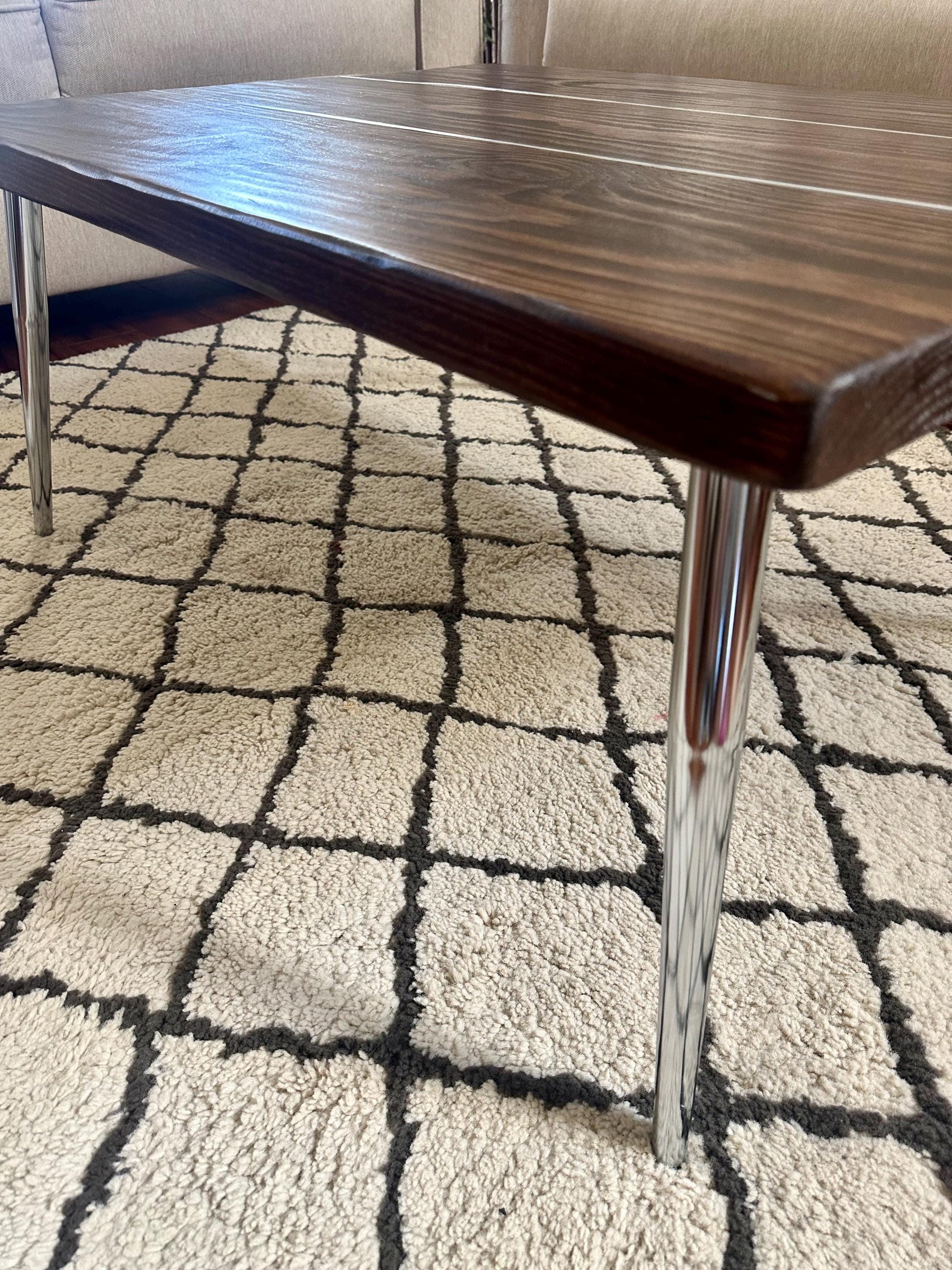 This modern coffee table is made of hand picked solid wood with a silver inlay and chrome legs.