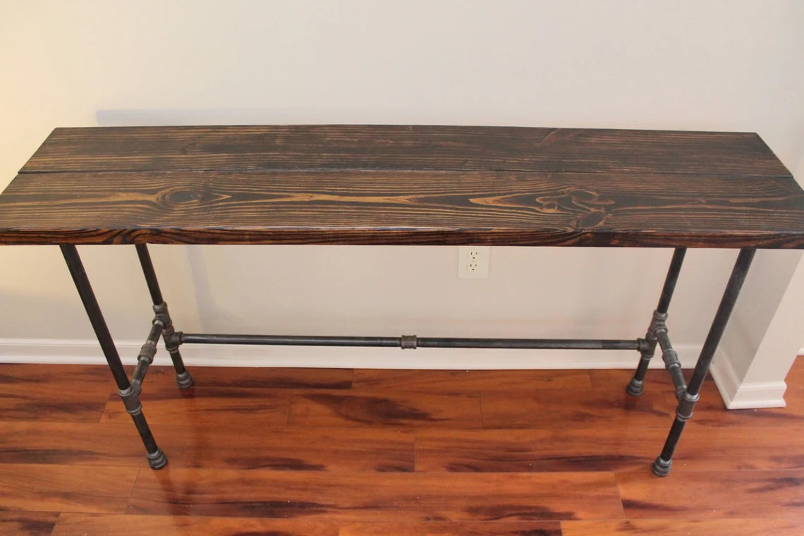 Organize your bottles and glasses with a custom sized wooden bar with steel legs. Build your table by choosing your dimensions, wood stain, and leg style.