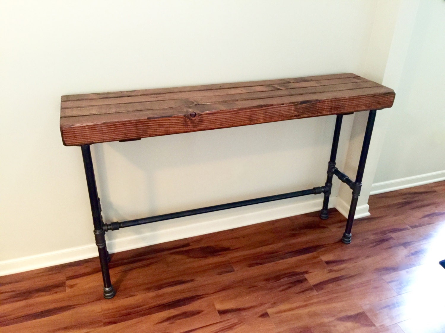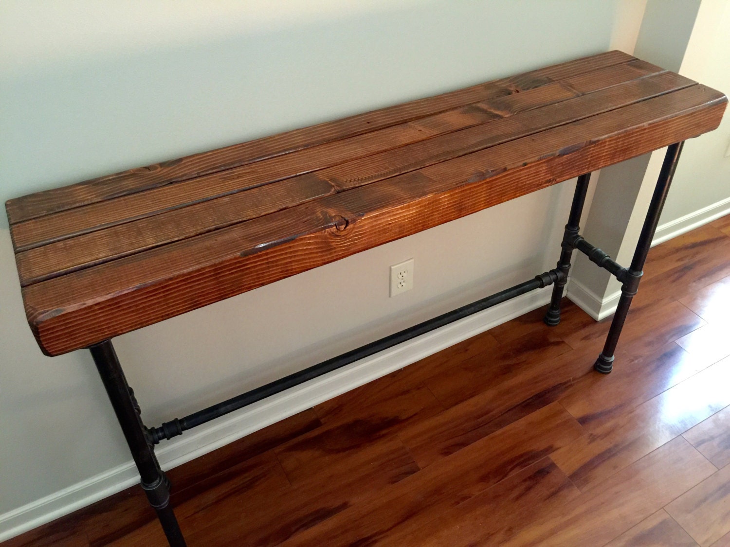 This rustic bar table is made of hand picked Premium Douglas Fir wood and 1" black steel pipe. The table shown is 54"L x 14"W and is 33" high with Early American finish. The table top is 3.5" thick. Feel free to contact us if you would like a custom size or stain.