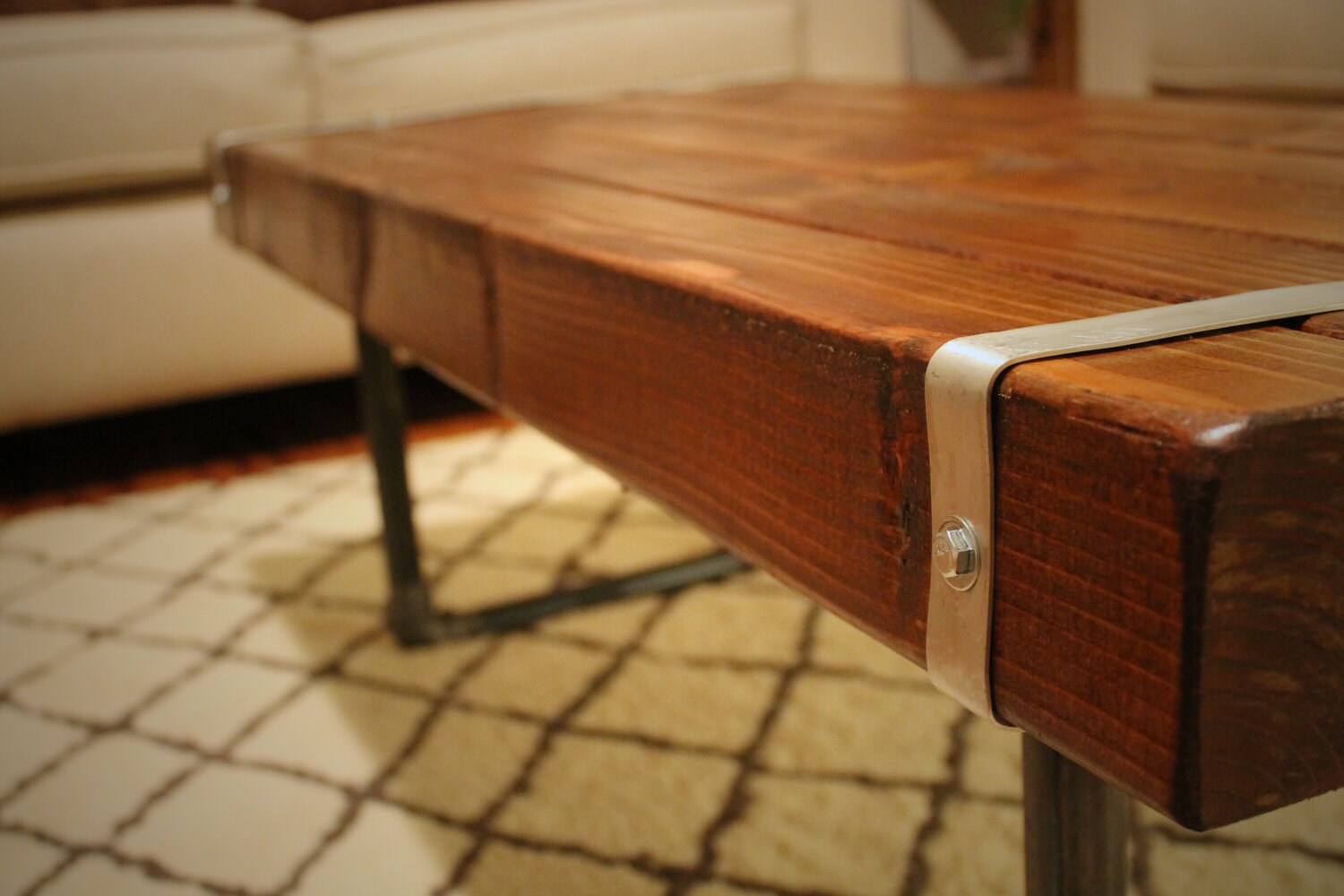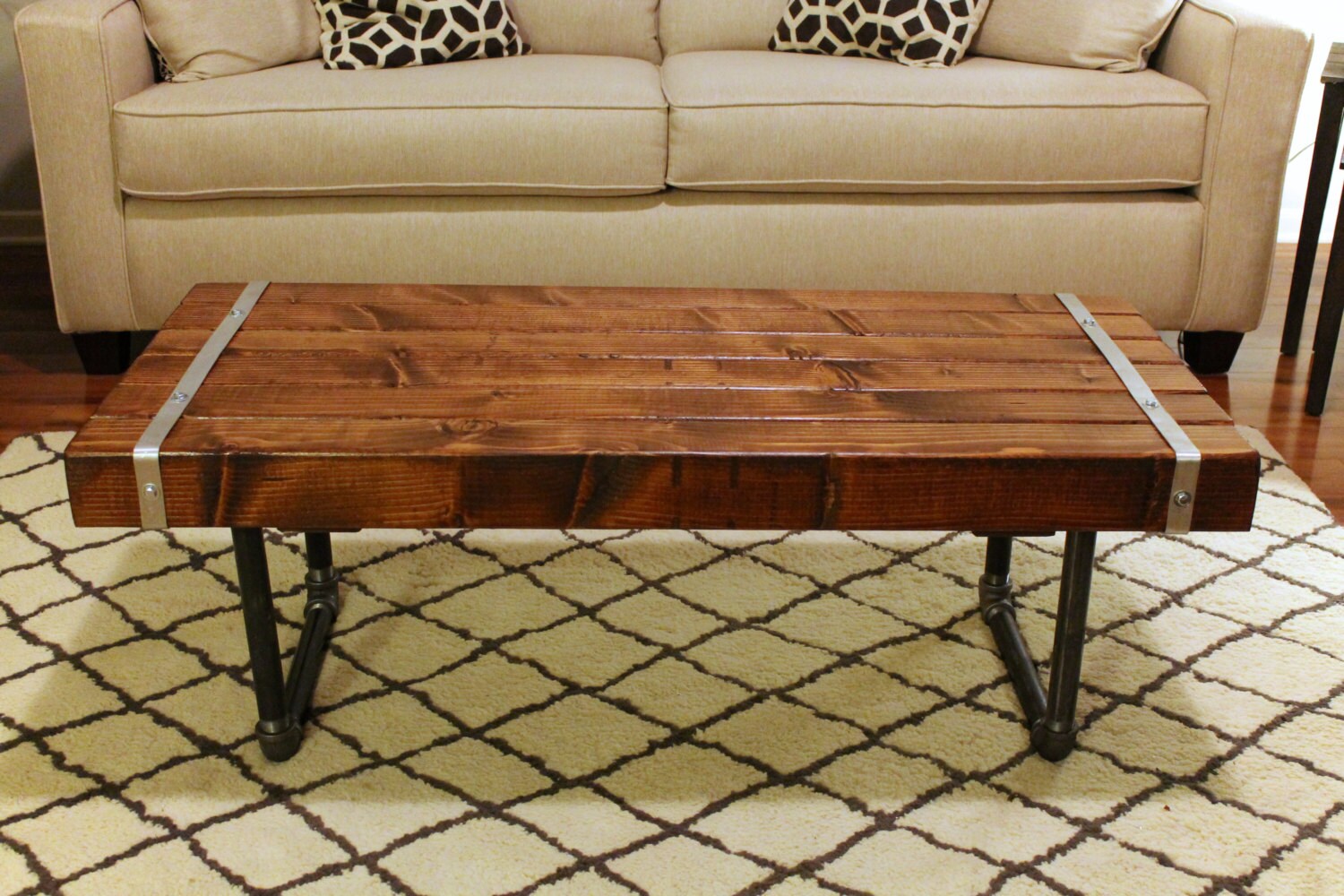 This rustic coffee table is made of hand picked Premium Douglas Fir wood and 1" black steel pipe. The table shown is 48"L x 21"W and is 17.5" high with Early American finish. The table top is 3.5" thick with with two 1" silver steel bindings.