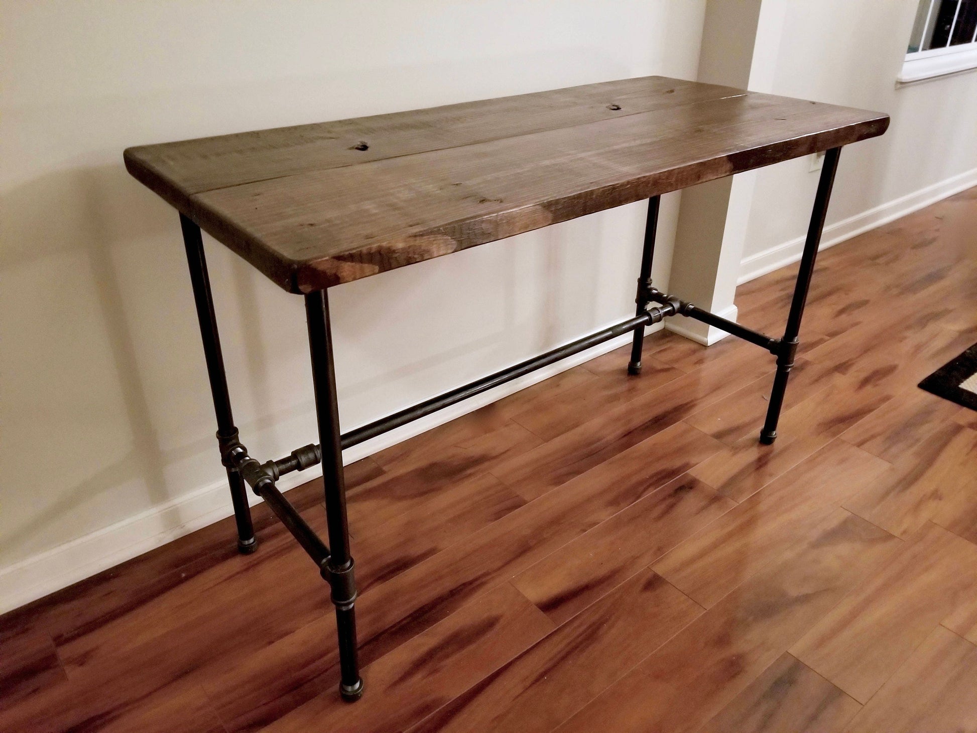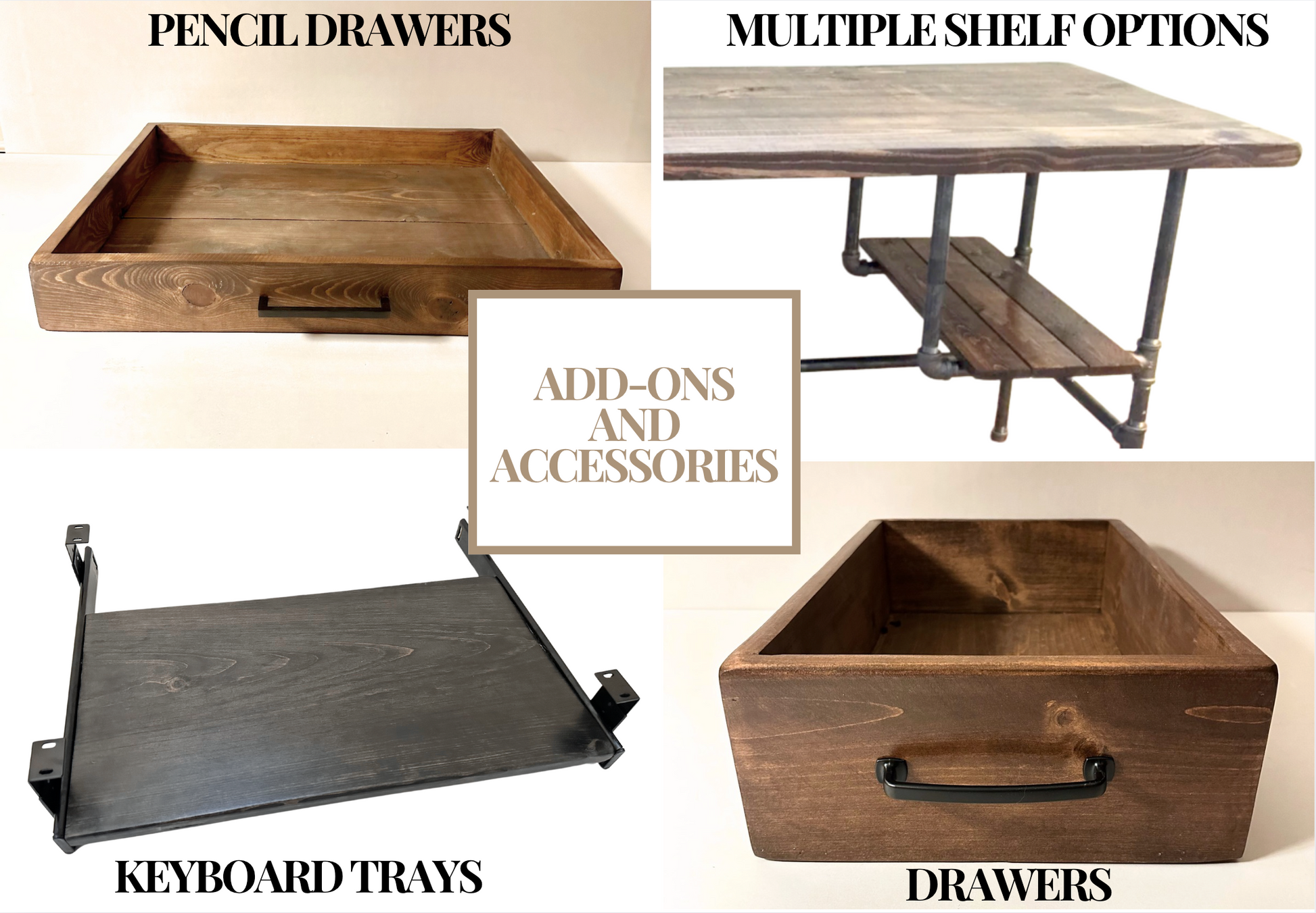 Desk is made of hand picked real solid wood and black steel legs/base. Desk shown is 48" x 22.5" and 30" high. Wood stain shown is Dark Walnut. Feel free to contact us if you are looking for any customizations (Size, keyboard tray, shelves, etc.) Happy to help!