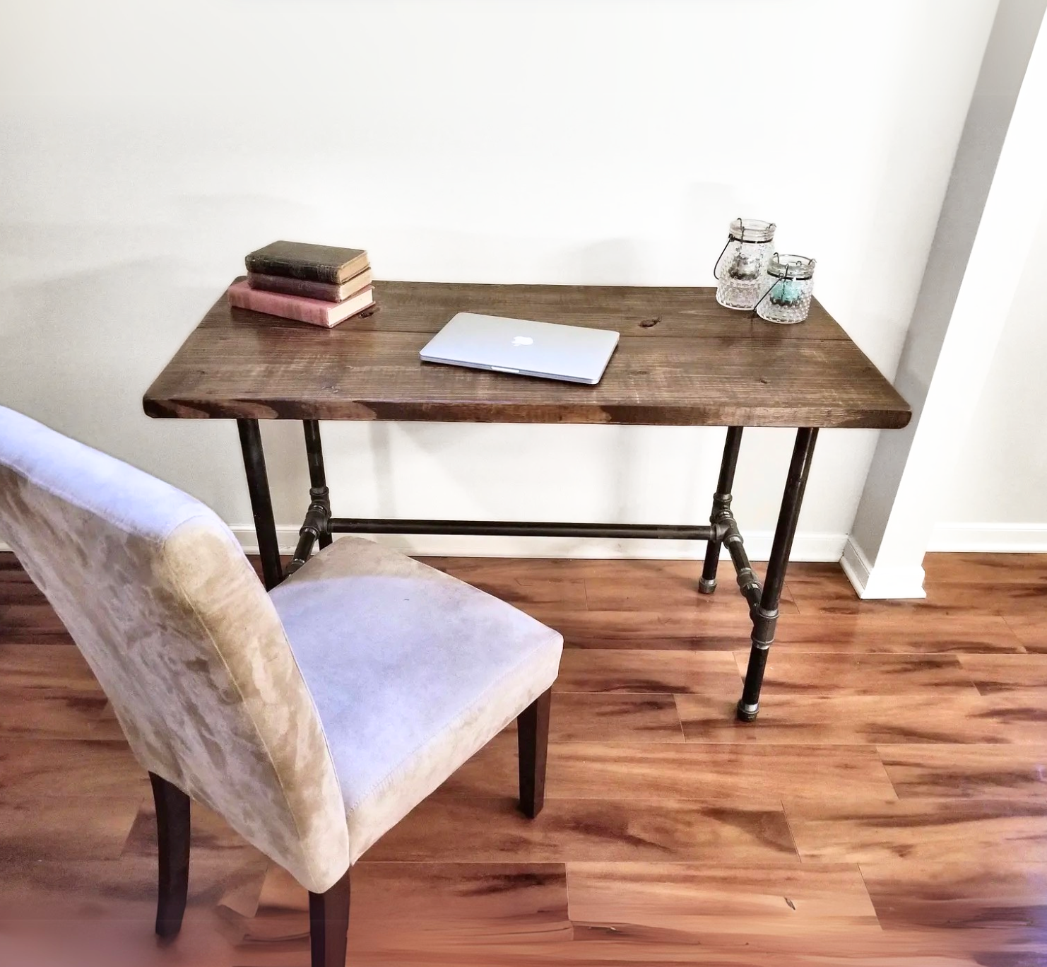 Desk is made of hand picked Premium Pine wood and black steel legs/base. Pipe size is 25% larger than the 3/4 pipe that is typically used (picture is provided for comparison) Desk shown is 48" x 22.5" and 30" high. Wood stain shown is Dark Walnut. Stains can be viewed here: https://www.steelandpine.com/stains/ Feel free to contact us if you are looking for any customizations (Size, keyboard tray, shelves, etc.) Happy to help!
