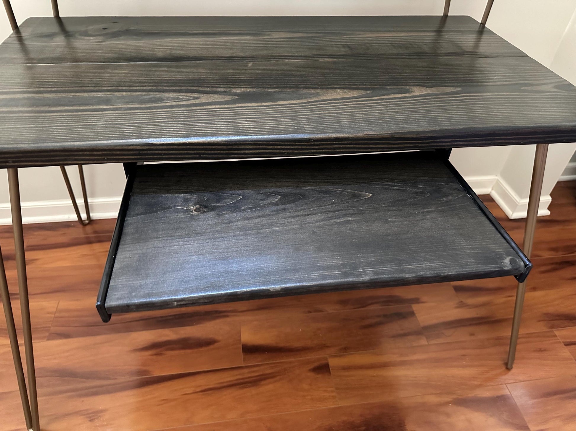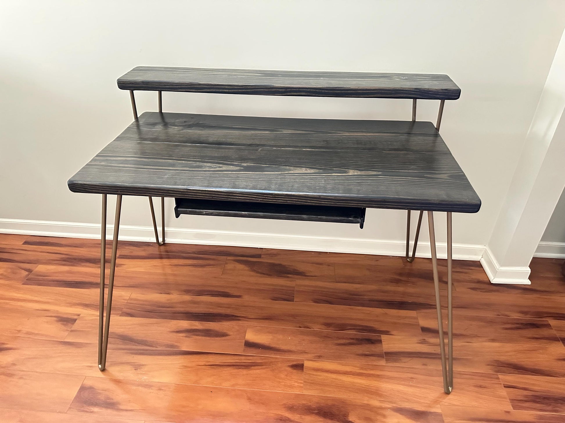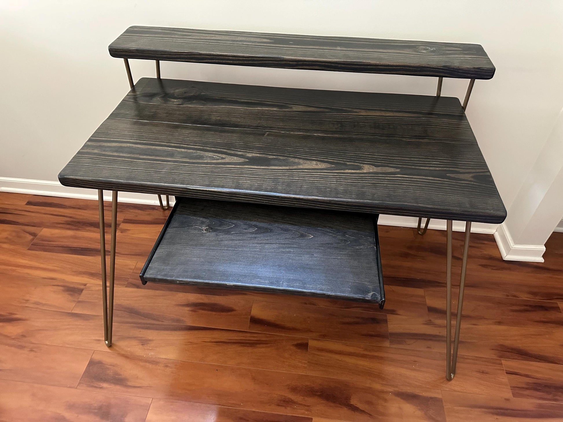 Desk is made of hand picked solid wood and gold finished steel hairpin legs/base. Monitor shelf is 7.25" deep. Keyboard Tray is 20"W and 11.25"D