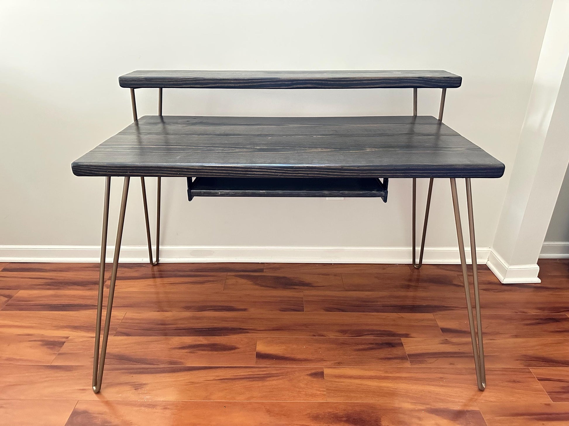 Steel and Wood Desk - Monitor Shelf - Gold Finish Steel Legs - Keyboard Tray - Real Wood Furniture