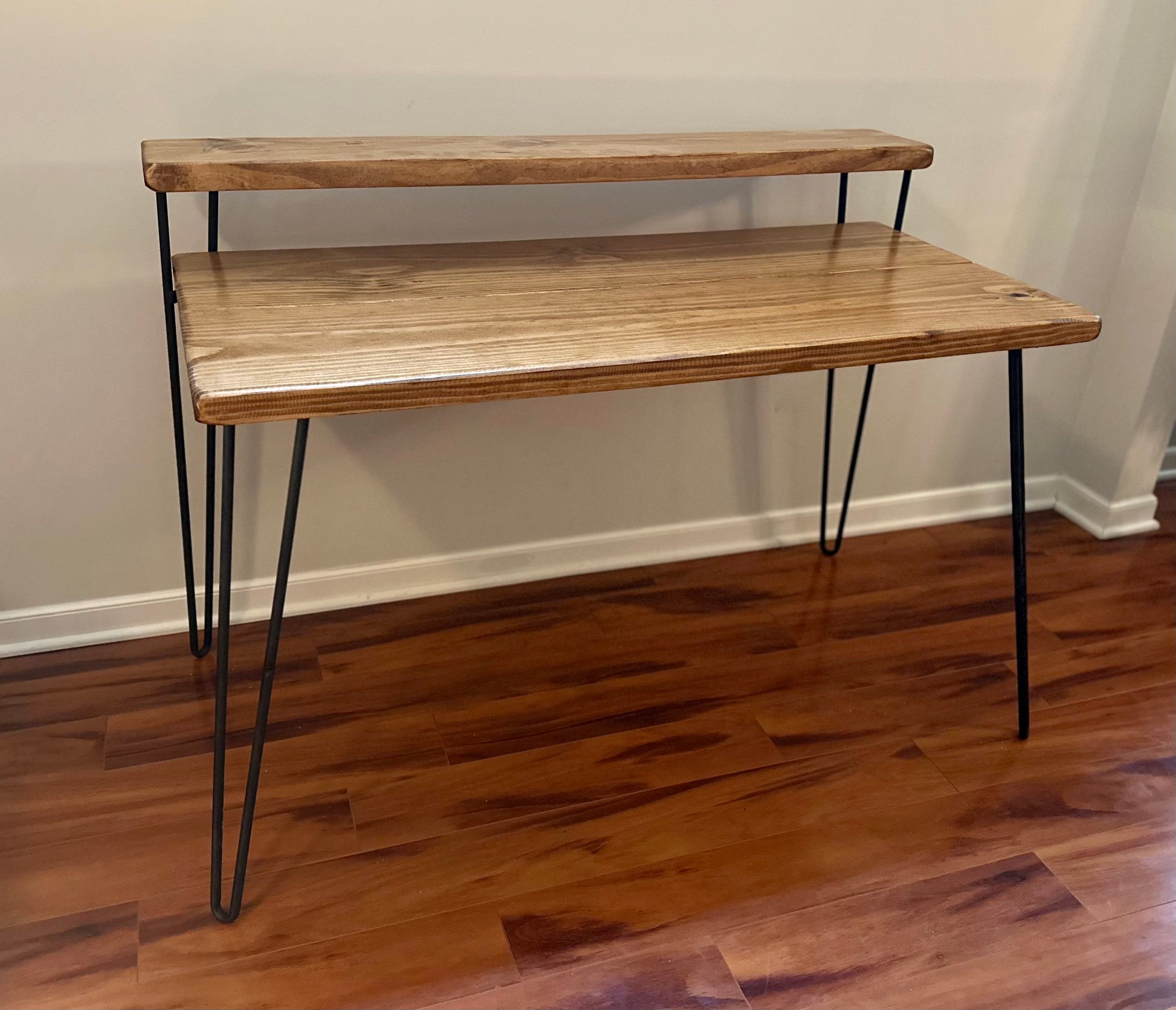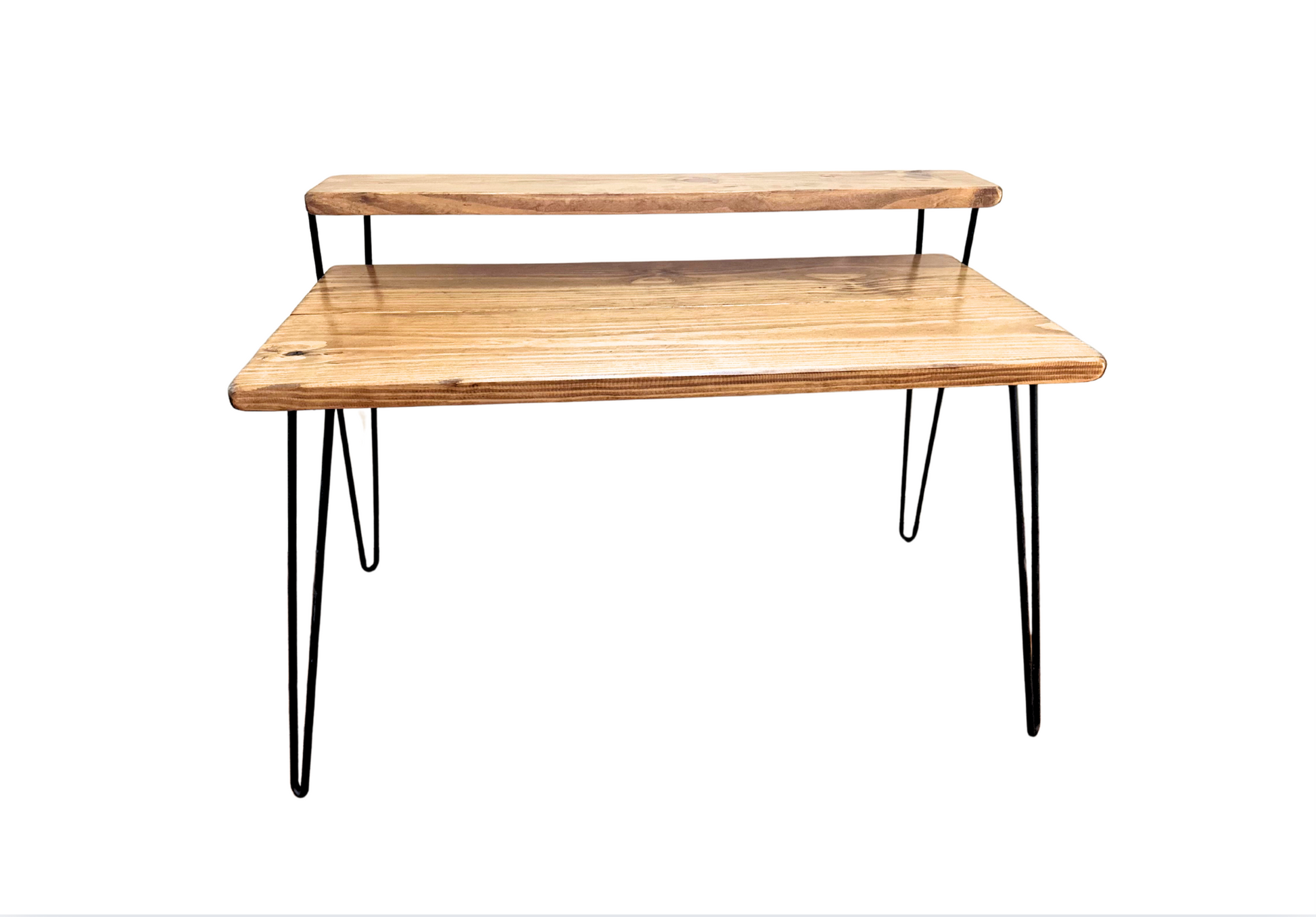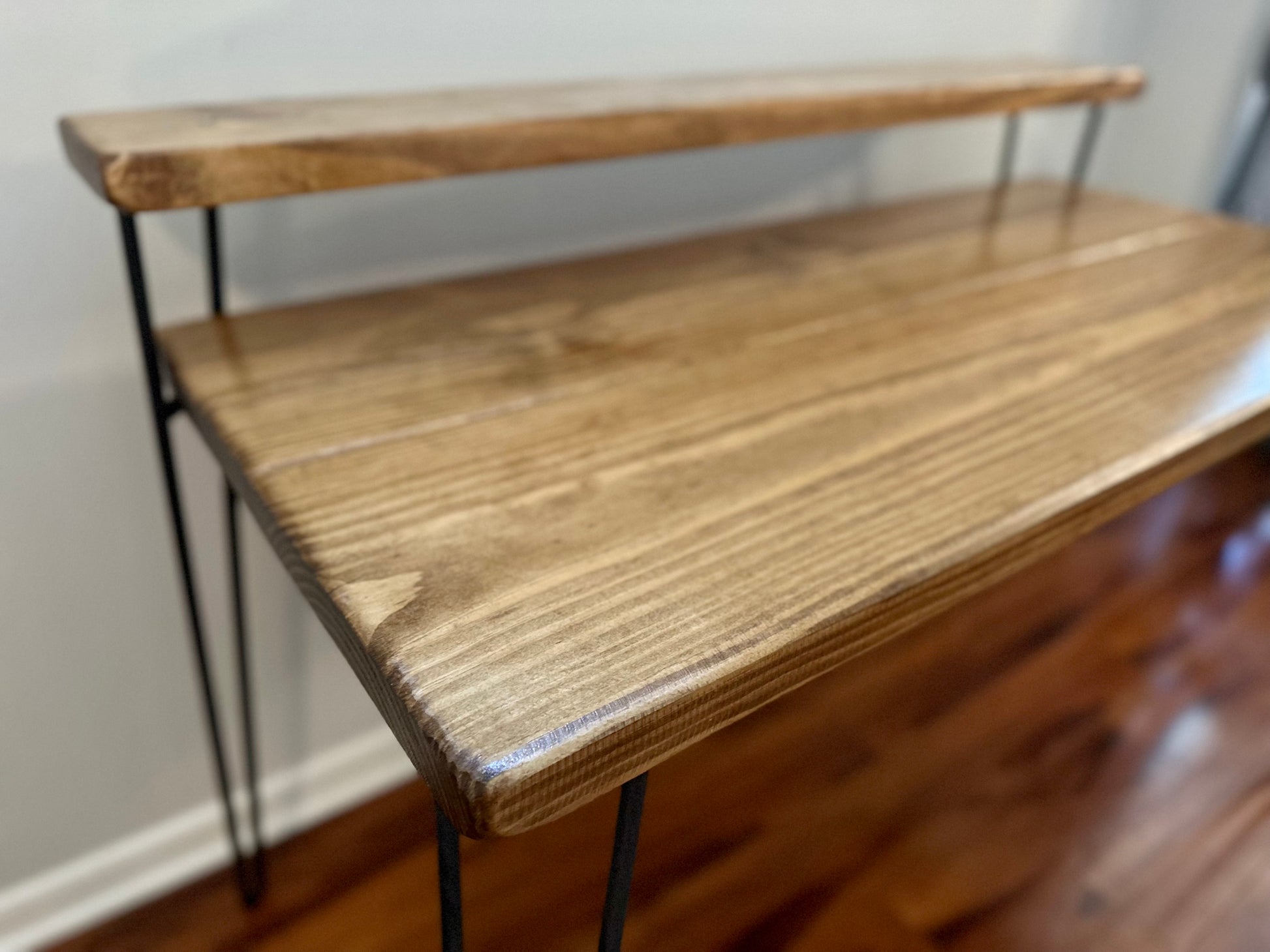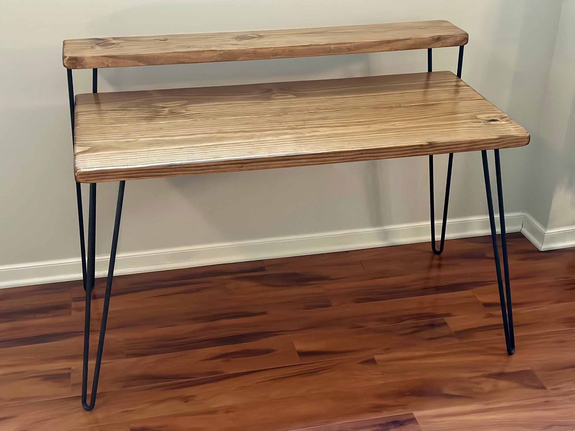 Desk is made of hand picked Premium Pine wood and black steel hairpin legs/base. Monitor shelf is 7.25" deep.
