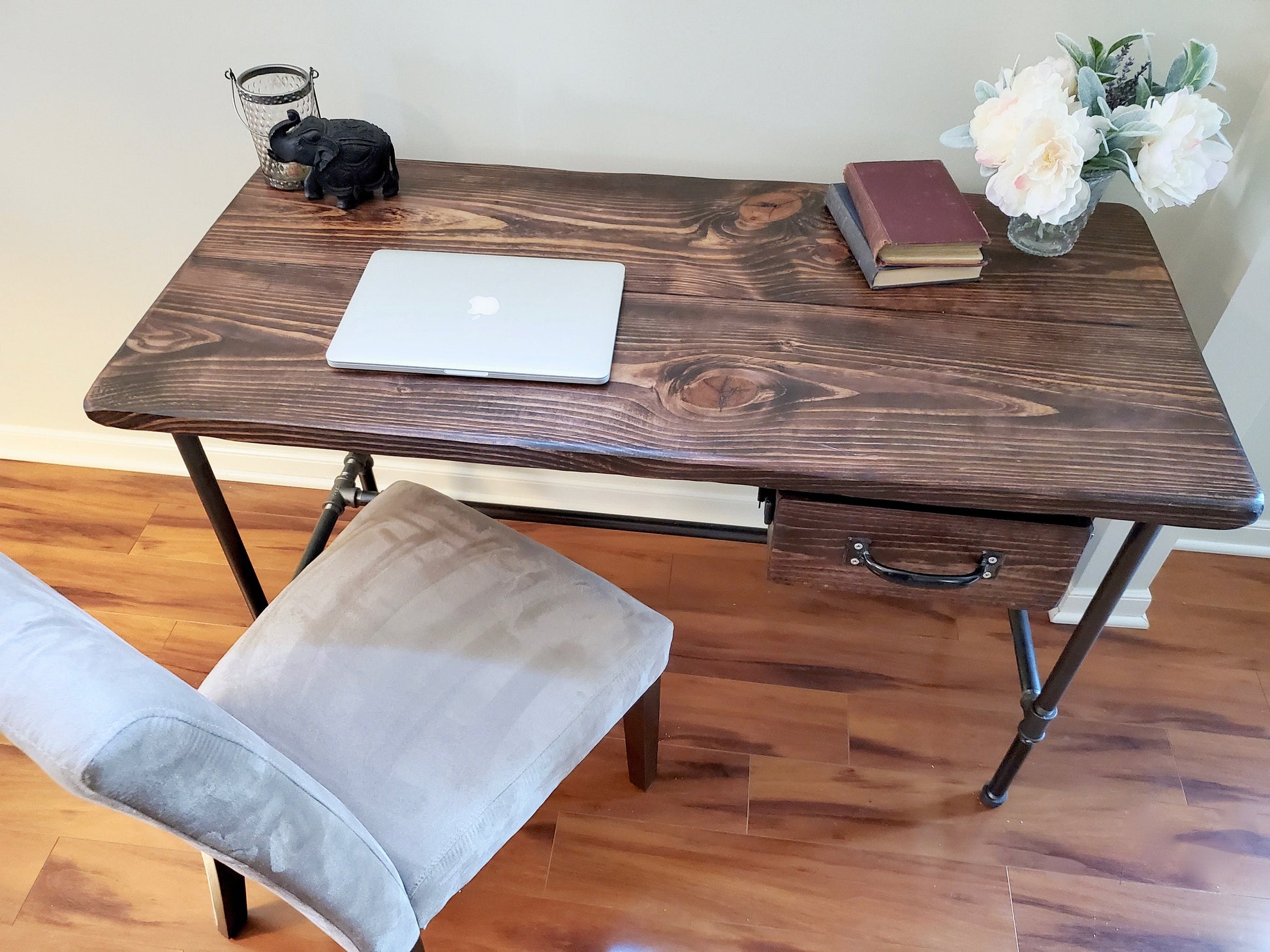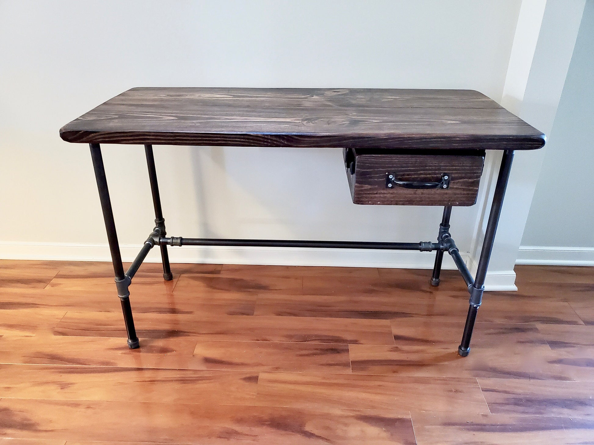 Desk is made of hand picked Premium Pine wood and black steel legs/base. Outside width of drawer is 12.75" (Can be made to 10.75" and 8.75") Customization - Drawer can be moved to left side. Second drawer can be added to the left side 2 total drawers. Can also be created as a standing desk. Contact us! We're happy to help! Desk shown is 48" x 22.5" and 30" high. Wood stain shown is Dark Walnut. Stains can be viewed here: https://www.steelandpine.com/stains/ Feel free to contact us if you are looking for a custom size or stain.