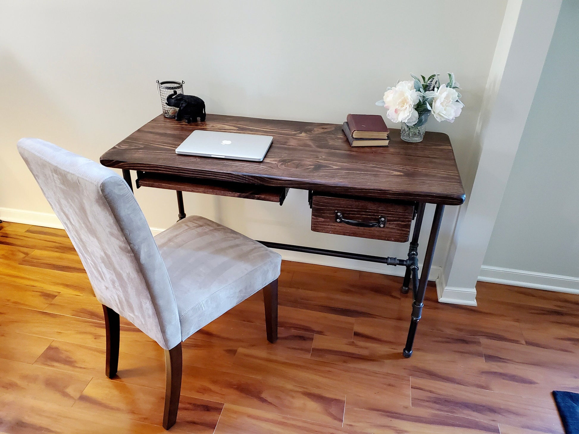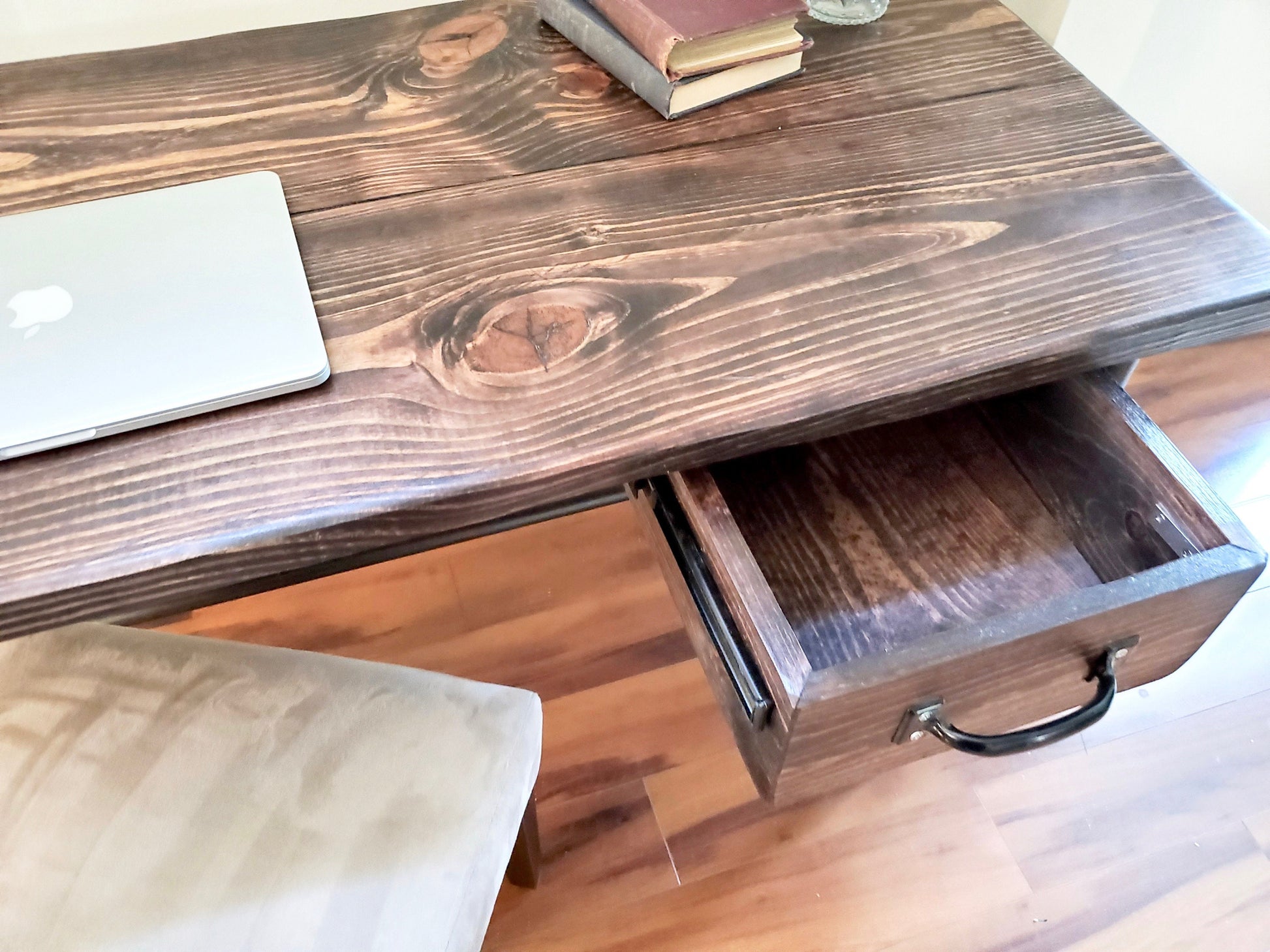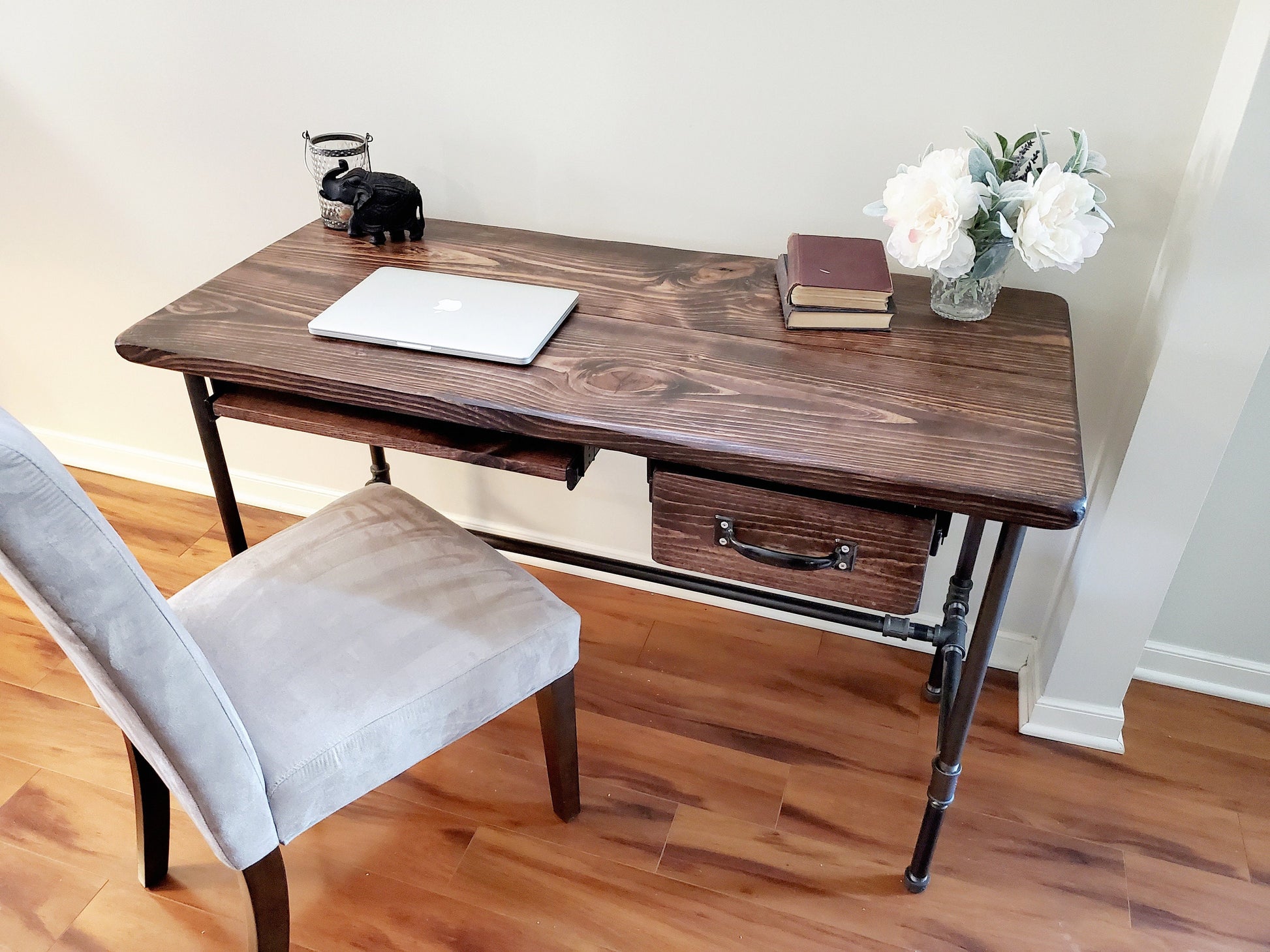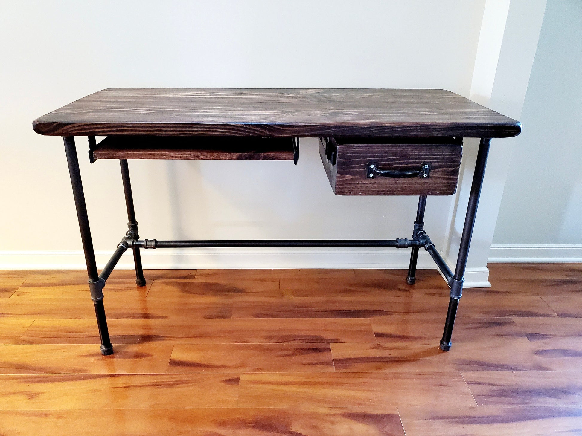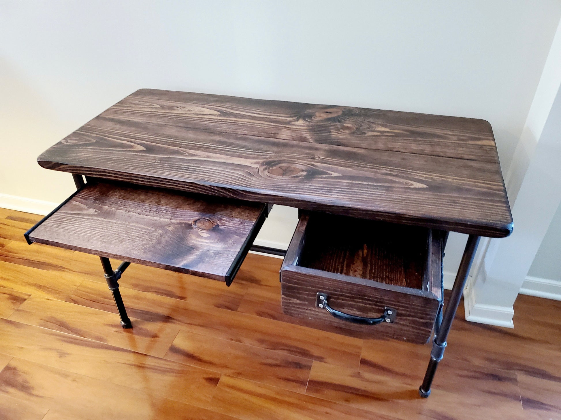 Desk is made of hand picked Premium Pine wood and black steel legs/base. Outside width of drawer is 12.75" (Can be made to 10.75" and 8.75") and a keyboard tray - 20" Customization - Drawer can be moved to left side. Second drawer can be added to the left side 2 total drawers. Can also be created as a standing desk. Contact us! We're happy to help! Desk shown is 48" x 22.5" and 30" high. Wood stain shown is Dark Walnut. Feel free to contact us if you are looking for a custom size or stain.